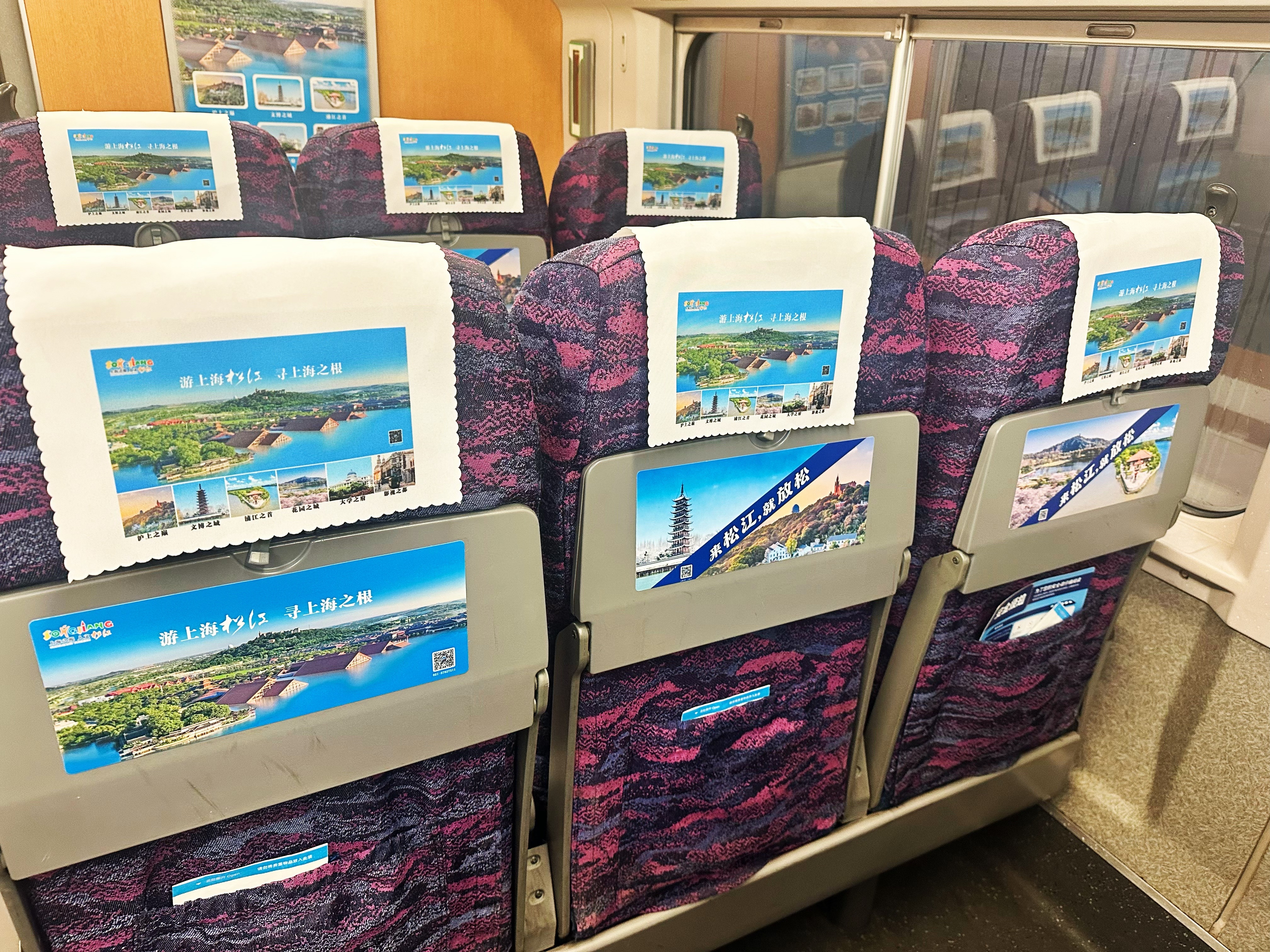 走进车厢,浓郁的松江元素扑面而来。记者观察到,每一张座椅的小桌板上,都印有佘山国家森林公园、广富林文化遗址等标志性景点的照片;头枕片上,“沪上之巅”“文博之域”“浦江之首”“花园之城”“大学之府”“影视之都”六大主题画面依次呈现;抬眼望去,车顶天幕呈现浦江之首、辰山植物园等地的优美全景;车门玻璃贴、车厢展牌则如一幅幅精致的邀请函,静静述说着松江的古今风情。可以预见,当列车广播伴随行程响起,向旅客介绍松江文旅资源时,整个车厢将形成一个全方位、包裹式的文化体验空间。