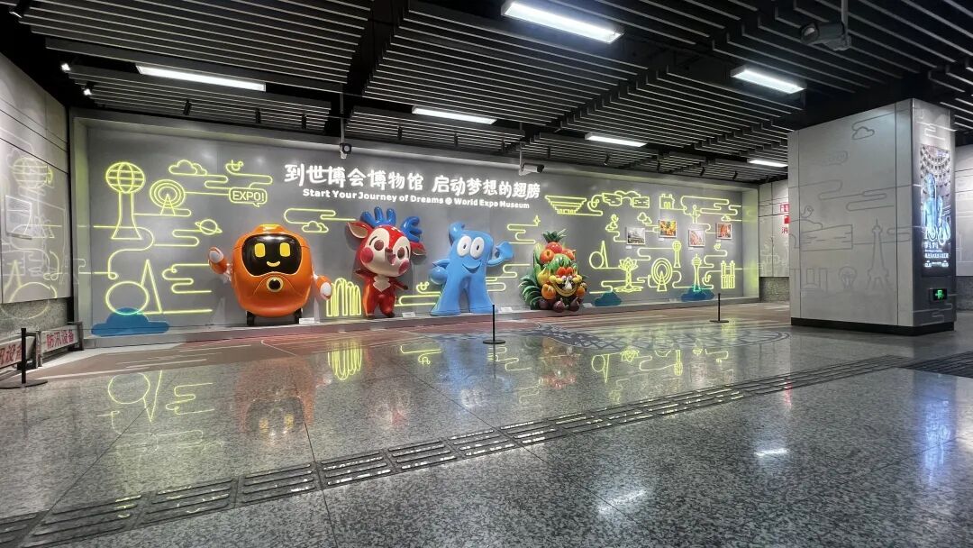 本次升级以“欢乐世博”为核心理念,在“打卡留影、空间叙事、情感共鸣”的三重维度下,构建起兼具美感与内涵的地下美学微空间。主题墙之上,2010年上海世博会至今的3届综合类世博会吉祥物与世博会博物馆吉祥物欢聚一堂,憨态可掬的形象传递着跨越时空的欢乐;背景铺陈世博会历届标志性建筑的线描长卷,流动的霓虹灯光勾勒出建筑轮廓,在明暗交错间重现国际盛会的璀璨盛景。同时,空间布局还暗藏巧思:可动态更新展项内容的金属相框、预留的主题海报立柱展示面,让文化传播保持新鲜活力;地面地贴复刻世博会博物馆建筑元素,搭配背景墙发光字体与LED灯光,营造出沉浸式的感官体验,让匆匆过客在步履之间亦能触摸世博脉络、感受“沟通、理解、欢聚、合作”的世博精神。主题墙上方“到世博会博物馆,启动梦想的翅膀”的标语,恰似一句温柔的邀约,牵引着人们探寻世博文化的深邃内涵。