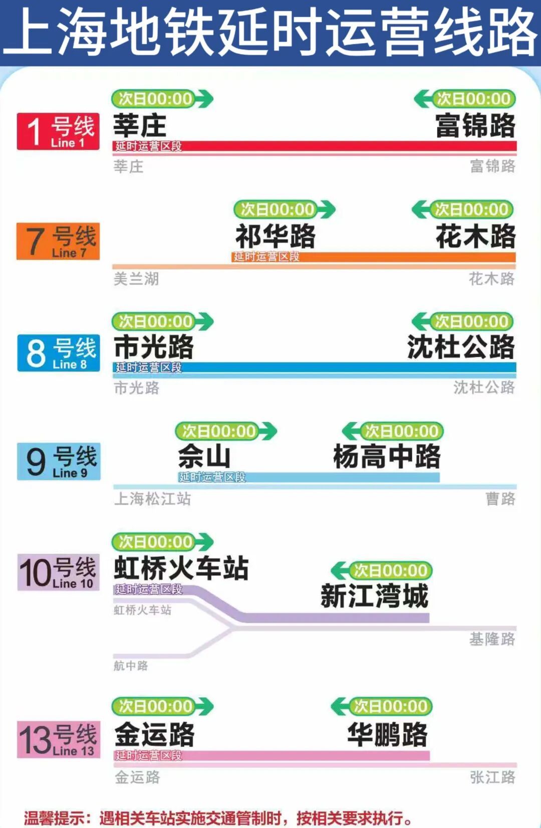 1、7、8、9、10、13号线延时运营