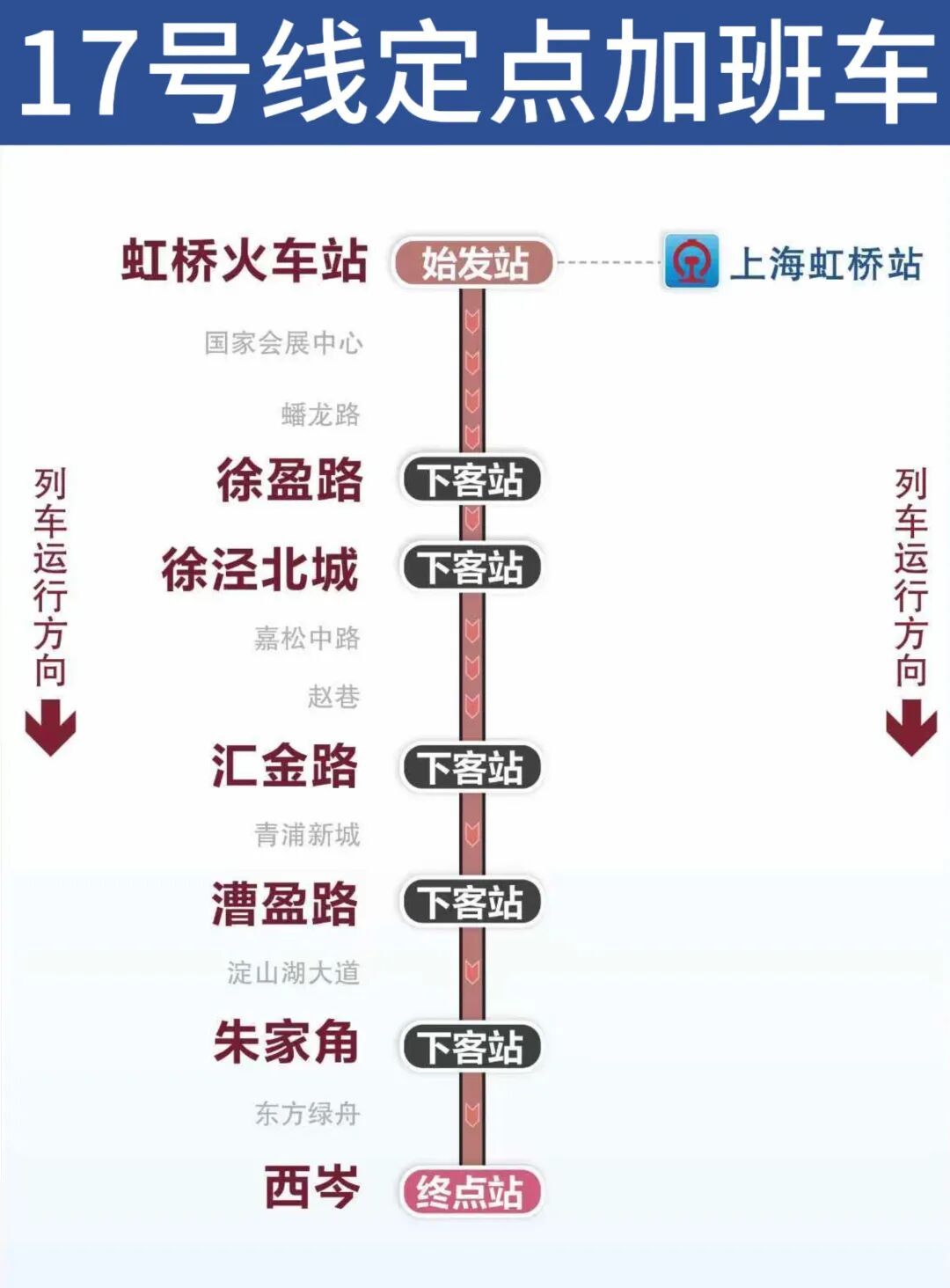 根据计划,“春运”期间,逢周日,2号线虹桥火车站站夜间定点加班车延至0点 。同时,2月21日,2、9、17号线加开末班车延长至次日0点(9号线在23:00和23:20加开的列车,自佘山站起按常态延时运营实施)。2月22日、23日,1、2、9、10、17号线加开末班车延长至次日0点。