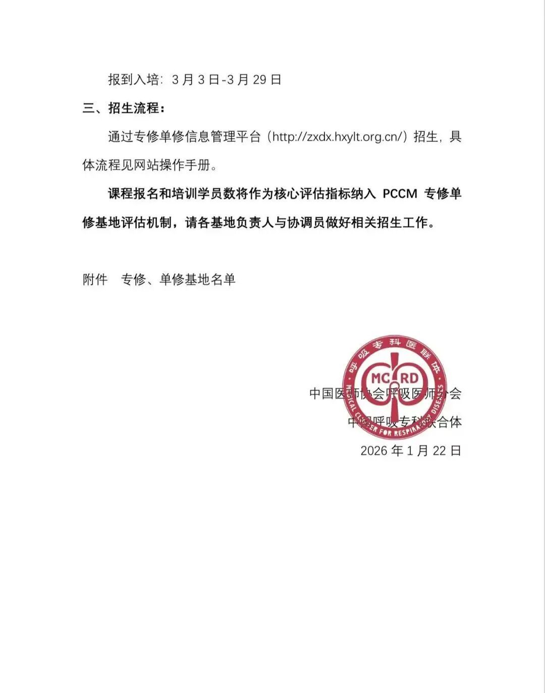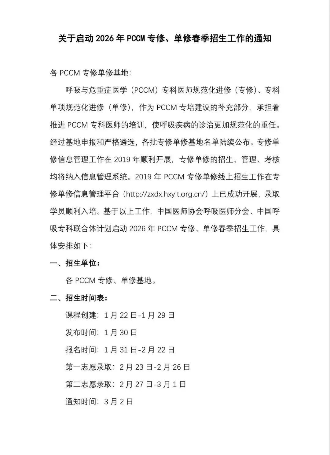 上海交通大学医学院附属瑞金医院呼吸与危重症医学科是全国首批PCCM规范化培训试点单位,同时还是首批PCCM专修基地,RICU,肺功能,睡眠医学,介入呼吸病,呼吸康复,呼吸治疗的单修基地。根据中国医师协会《关于启动2026年PCCM单修冬季招生工作的通知》要求,我科启动PCCM的单修网上报名工作,具体招生内容介绍如下: