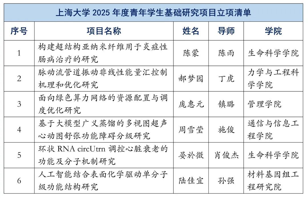 2025年,上海大学取得该项目的试点依托单位资格,学校自接到项目启动通知后,高度重视申报组织工作,校领导亲自指导校内遴选推荐工作,要求真正选拔推荐一批科研有余力、基础扎实,在科学研究中展现出较强发展潜力的优秀博士研究生从事基础和学科交叉研究。推荐选拔方案由科研管理部制定,最后经学院严格审核及选拔,学校再优中选优,从近100项报名项目中遴选了20项推荐申报。