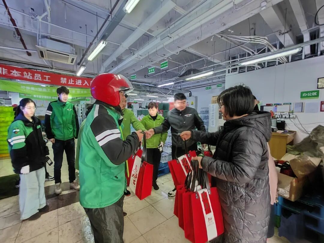 细雨霏霏挡不住新春暖意,第一网格的工作人员带着精心筹备的新春大礼包,走访慰问了德邦、叮咚买菜、山姆、圆通等站点的快递员、外卖员。礼包里的护手霜、保温杯,皆是针对他们户外工作的贴心准备,一句句新春祝福,让奔波在街头的新业态从业者倍感温暖。收到礼包的快递员、外卖员纷纷拍照留念,直言这份祝福让冬日不再寒冷,更期盼着马年万事顺遂。