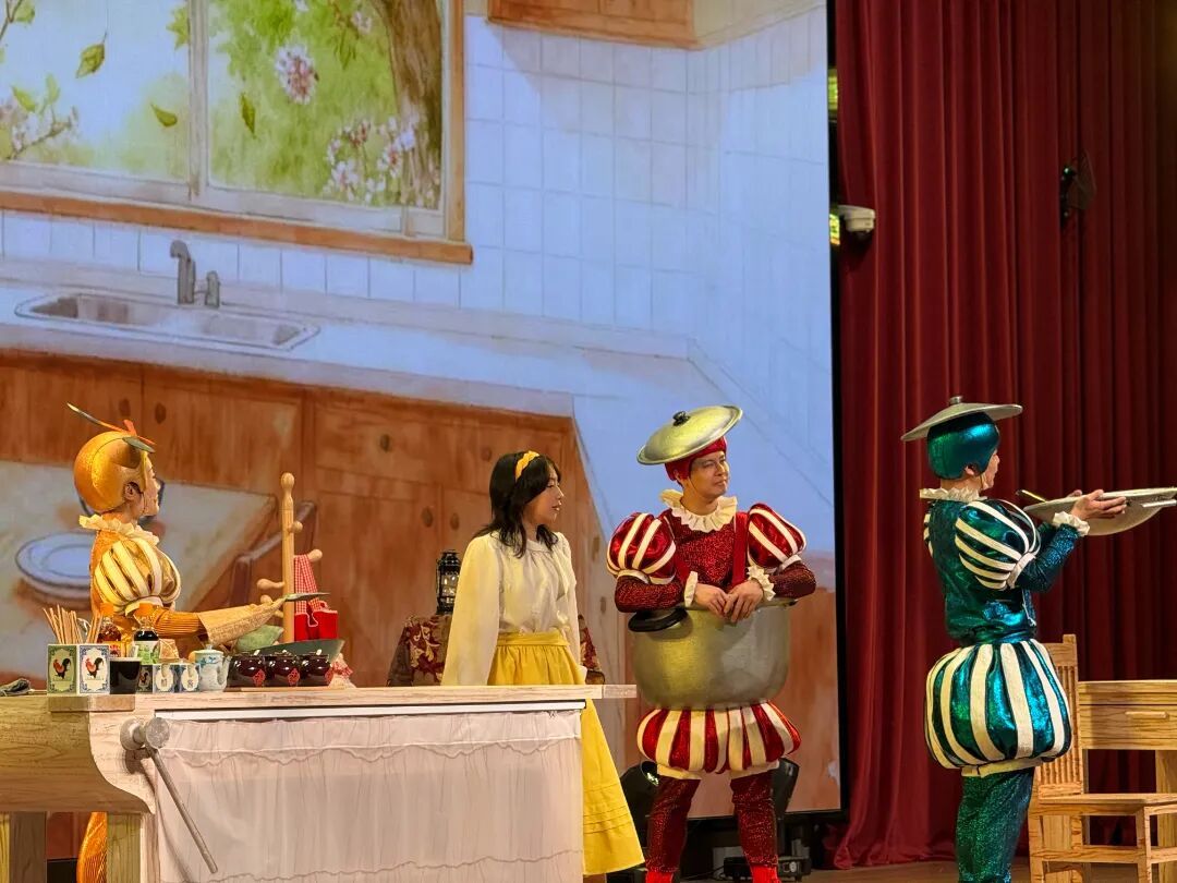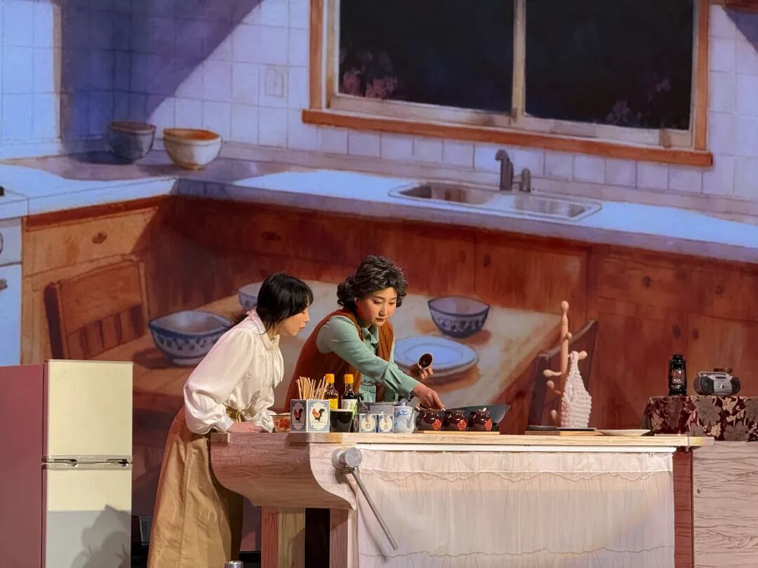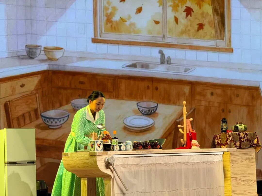 当舞台灯光暗下,童年老宅的厨房在舞台上重现。沉稳的大炖锅、活泼的小炒锅、俏皮的铲子精灵依次苏醒,带领观众穿越三十年时光。从清晨的糖水蛋到深夜的手擀面,从外婆传下的红烧肉秘方到智能时代的厨房变迁,每一个场景都涌动着熟悉的烟火气。