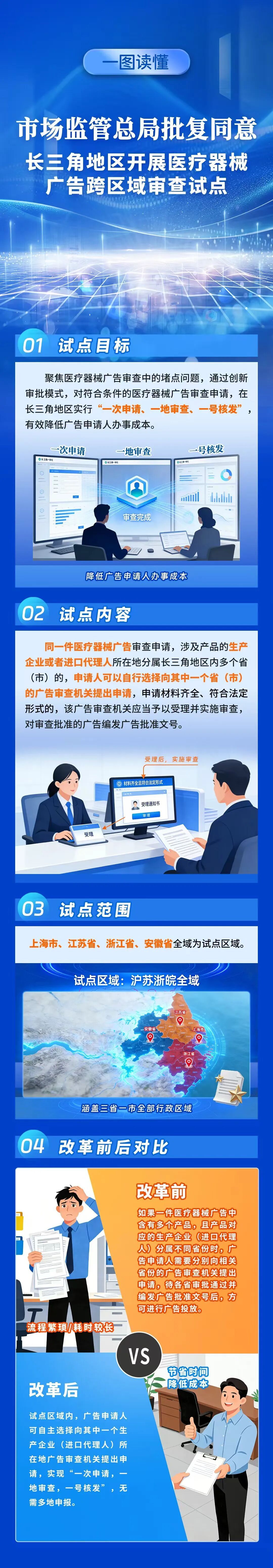 近日,市场监管总局批复同意上海市、江苏省、浙江省、安徽省市场监管局在长三角地区开展医疗器械广告跨区域审查试点工作。