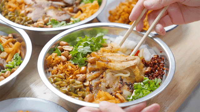还可以加入卤牛肉、酸豆角、炸黄豆,搭配骨汤,一口鲜香,一口美味,实现“干湿分离”的地道吃法。