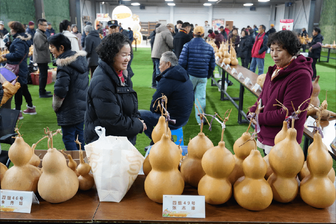 清晨,签约农户们便带着精心呵护的“宝贝葫芦”陆续抵达。圆润饱满的传统款、造型别致的异形款、纹路精美的工艺款纷纷亮相展示区,宛若一场葫芦“选秀”。村民们脸上写满期待,“天天浇水修枝,就盼今天能评个好彩头!”张阿姨一边擦拭葫芦一边笑道。