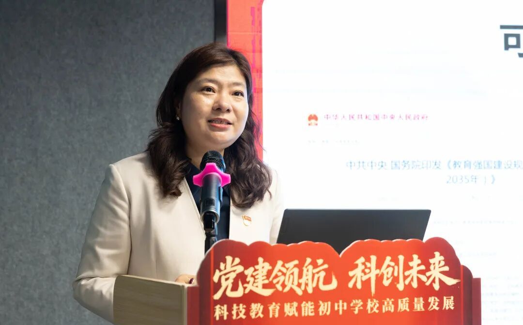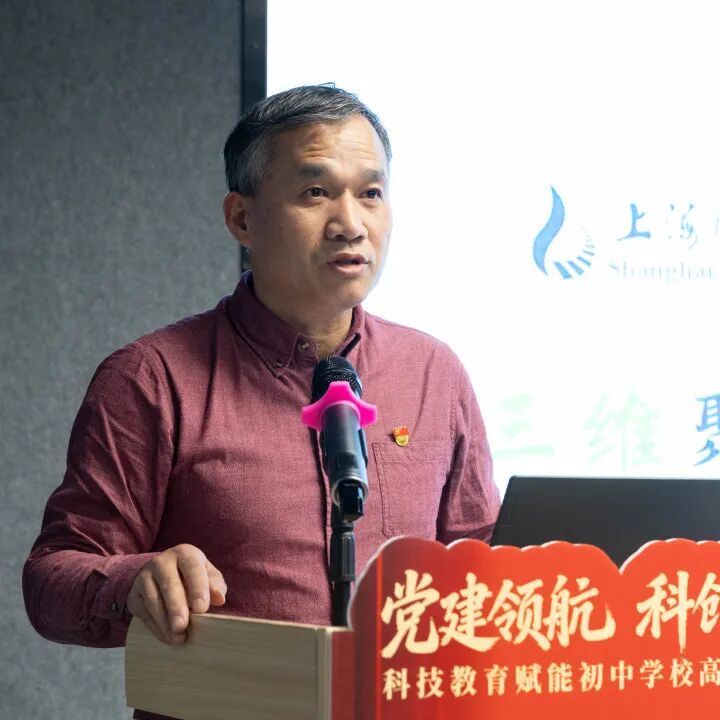 在主题交流环节,三位教育管理者代表分享了各自学校的实践探索。上海师范大学附属金山前京中学党支部书记、校长夏玉芳在题为《融合应用数平台 智教慧学向未来》的演讲中,从顶层设计、课程重构、课堂变革三个层面分享了“智教慧学”的具体实践。上海市格致初级中学党总支书记、副校长黄岳平发表了题为《三维聚力 育见未来——基于“课程-师资-评价”的科技教育实践与探索》的演讲,他强调科技教育应“培养学生像科学家一样思考,像工程师一样实践”。上海市铁岭中学党支部书记、校长葛琛静以及上海市铁岭中学教师蒋亦文则带来了《党建引领初中学校开展科技教育的支持系统建设》的分享。