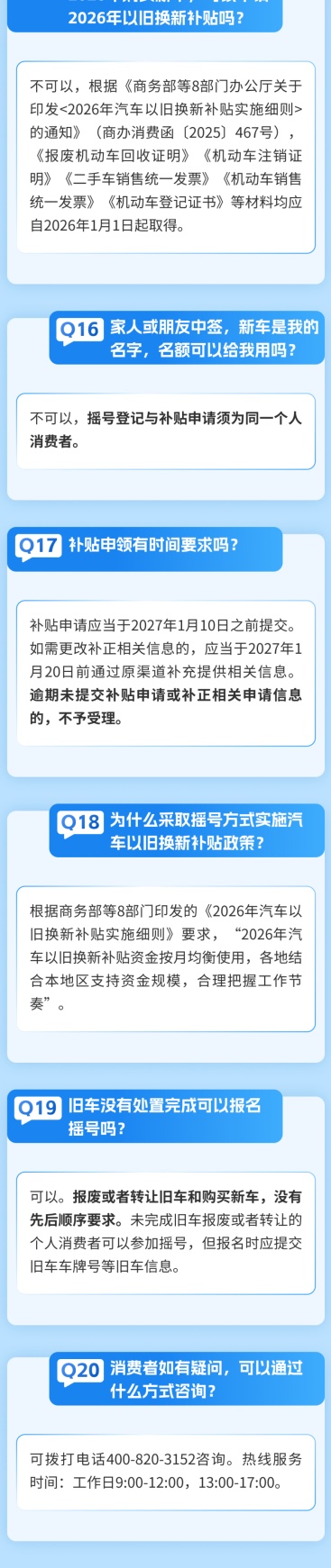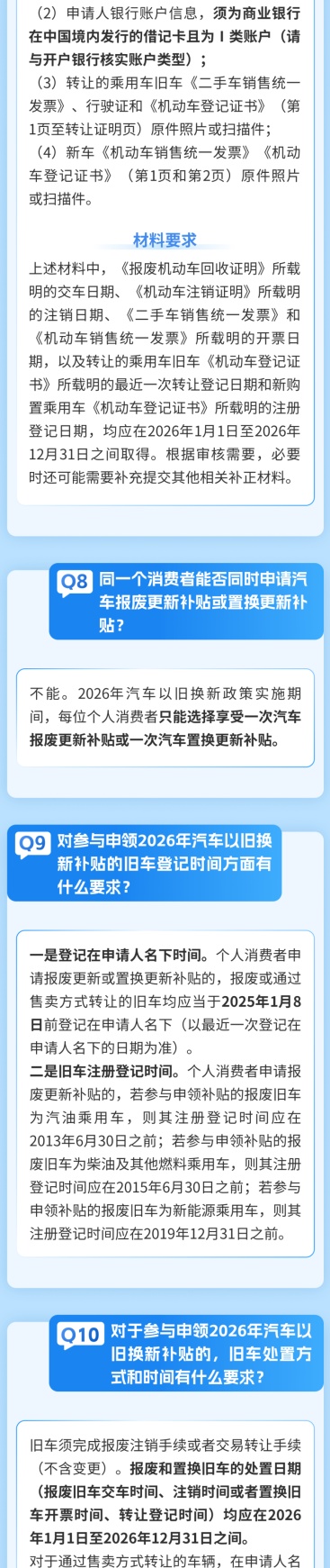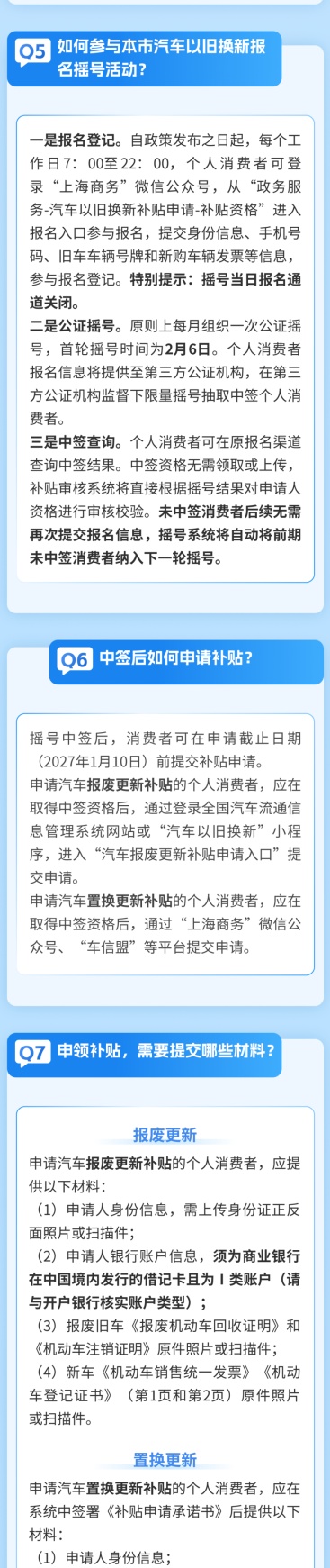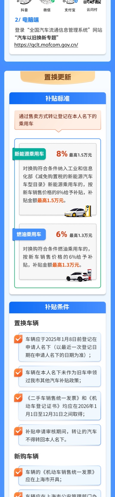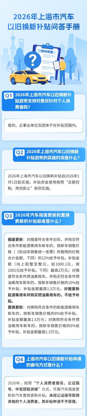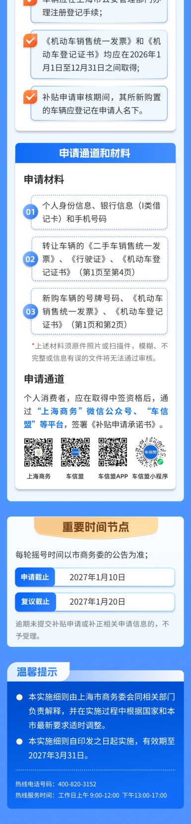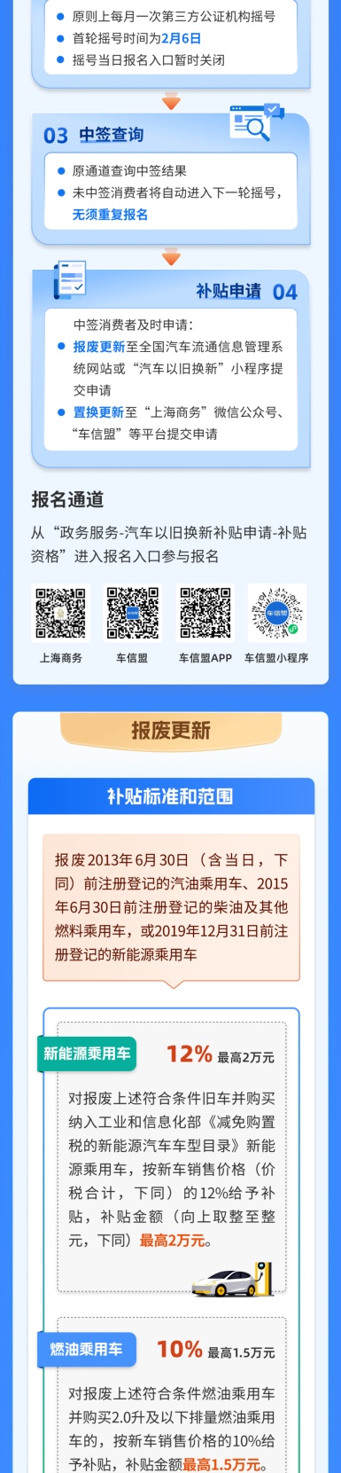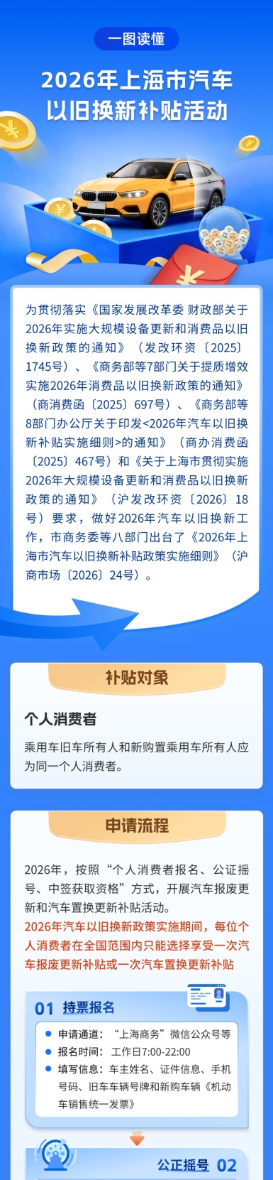 市商务委介绍,《2026年上海市汽车以旧换新补贴政策实施细则》出台,为个人消费者提供汽车报废更新和汽车置换更新补贴活动。详见↓