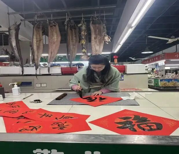近日,阳普阜新菜市场内人头攒动,青菜、大白菜等平价菜供应充足,改造后的“场中店”里蔬菜、水果、肉类等品类丰富。市民们围拢在摊位前,手中除了蔬菜,还多了一份特别的收获是手写的“福”字或是糖画。市民表示“这里的菜价格相对实惠,买菜满额还送手写的‘福’字,感觉年味一下就来了!”