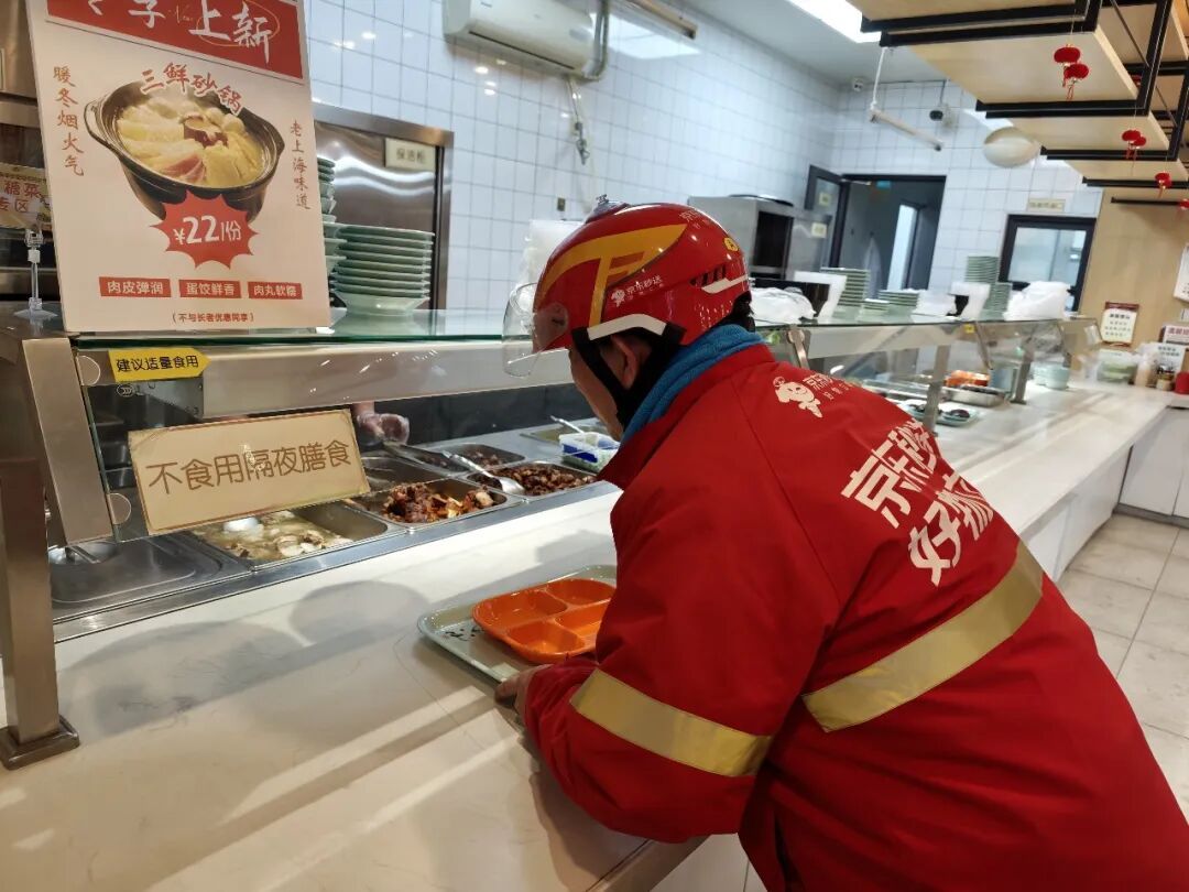 寒风中,一位身穿京东红色制服的骑手推开食堂玻璃门,蒸腾的热气与扑鼻的菜香迎面而来。他熟悉地走向点餐台,对窗口内的阿姨笑了笑:“今天单子跑得顺,给我来个12元的套餐!”