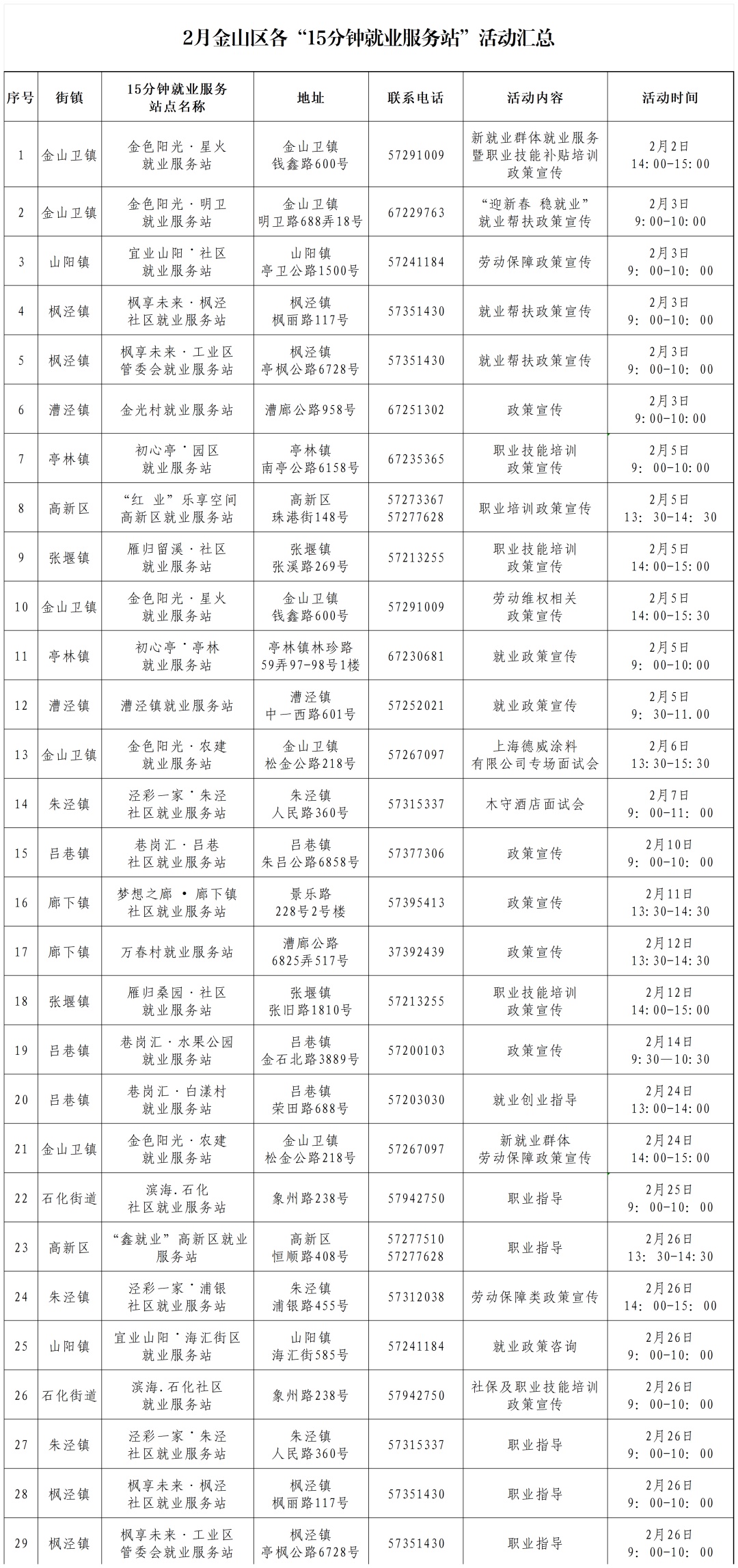 2月金山区“15分钟就业服务站”就业服务活动看这里!有29场线下活动等着您来,职业指导、面试会、就业创业沙龙、政策宣讲等应有尽有,在“家门口”即可“找工作”“查政策”“看活动”。