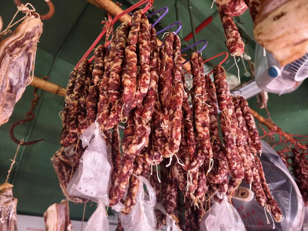 随着农历春节的日益临近,黄浦街头的年味也愈发浓厚。在位于鲁班路517号的江南菜场,门口已经张贴好凸显年味的大红春联。再往里走,整排的肉类摊位散发出的香气让人忍不住停下脚步。腊肠、腊肉、酱油肉、鳗鱼鲞等腌腊制品高高悬挂,告诉大家新年即将到来。