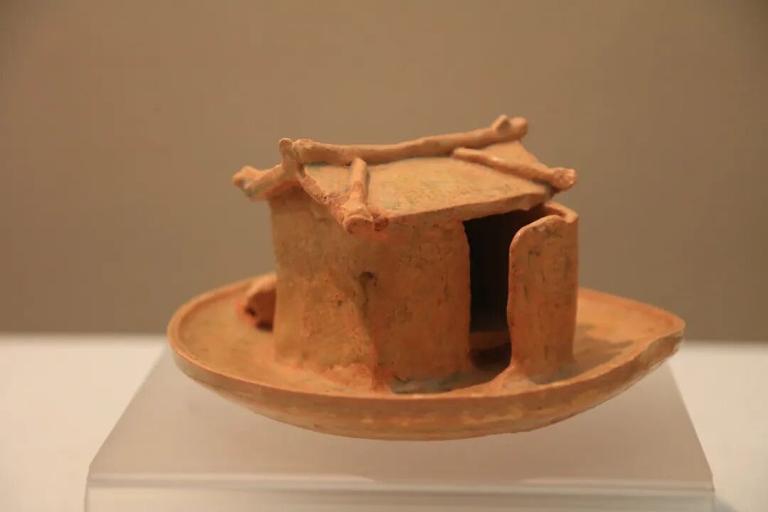 两晋、南北朝时期,是洪州窑生产发展的上升期。展厅中一件青瓷厕所展品尤为引人注目:屋形结构,双斜坡面顶,圆木做屋脊,屋面上压条,四面均围墙,一侧边开门,门外附加曲折屏墙,屋内设有蹲坑。后壁开一圆洞,洞外一狗一猪相对而立,呈现了一幅乡村野趣的景致,生活气息浓郁。