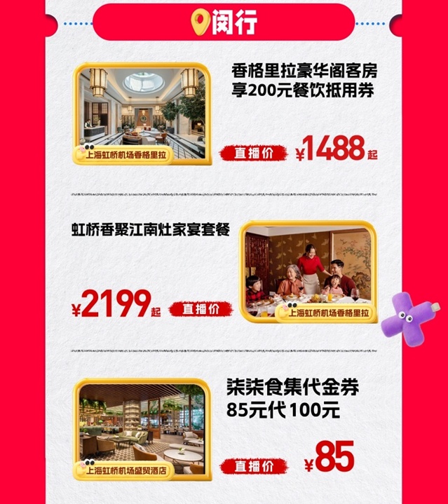 2月1日,来抖音看“旅选上海・超级新春”直播!主持人衣漪携手闵行区文旅推荐官——闵行区文化和旅游管理事务中心主持人夏芸凯、上海虹桥机场香格里拉及盛贸酒店市场传媒总监俞唯,带你一站式get闵行新春吃喝玩乐全攻略,更有酒店专属优惠限时开抢,这场直播不容错过!