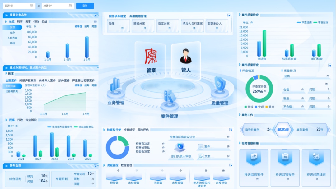 ➤升级“三个管理”数据驾驶舱。围绕构建检察大管理格局、一体抓实“三个管理”新要求,研发“三个管理”数据驾驶舱,探索构建管理闭环,实现办案与管理同步衔接、管案与管人有机结合。研发部署检察业务宏观观测体系;在“数据驾驶舱”新增10个专题分析,智能提示办案临期、挂案清理线索、羁押必要性审查等;开发覆盖起诉书、检察建议书等33类重要文书的智能检索、毒品惩防系统、检察侦查线索管理等小工具,丰富管理维度,细化管理精度,实现案件管理从“经验驱动”到“人机协同”的初步跃迁。