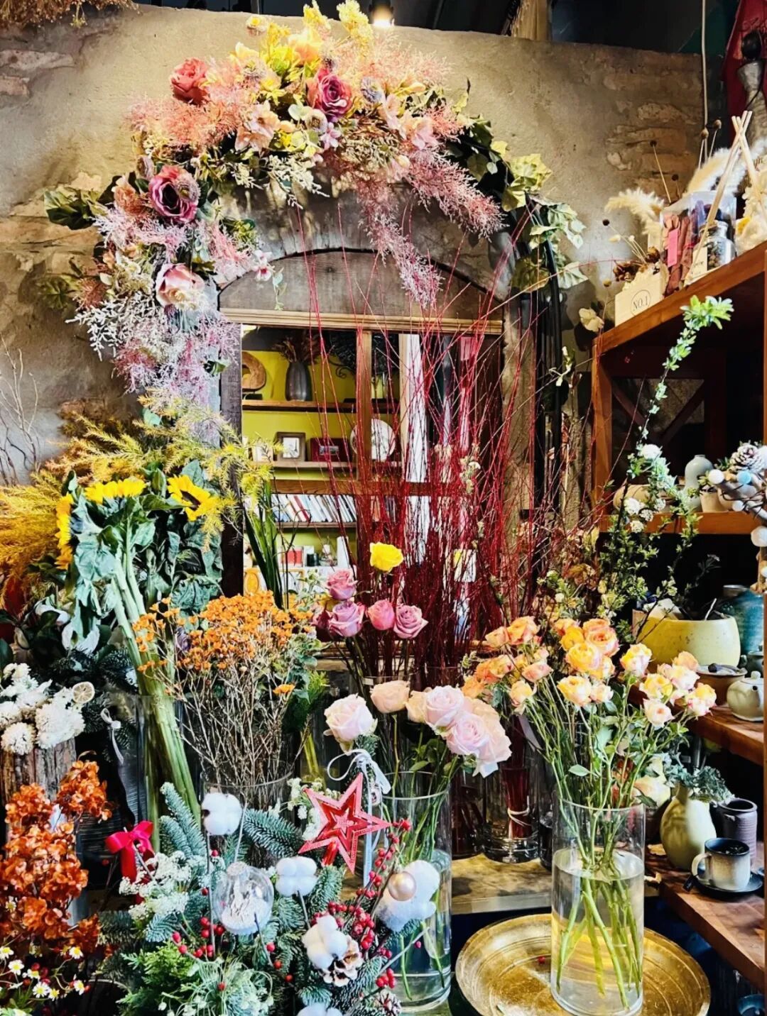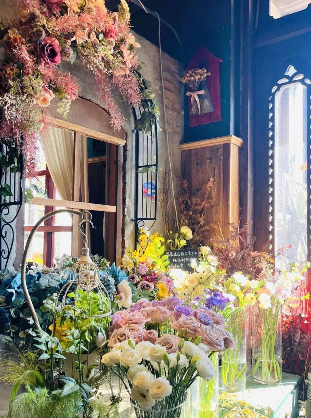位于顾村公园附近的老网红,咖啡与花店的奇妙结合,这方空间仿佛将整座秘密花园折叠进了室内,墨绿的仿真藤蔓如瀑布般从天花板倾泻而下,叶片层层叠叠,有几缕枝蔓悄悄拂过窗棂,在日光中投下斑驳的影子。