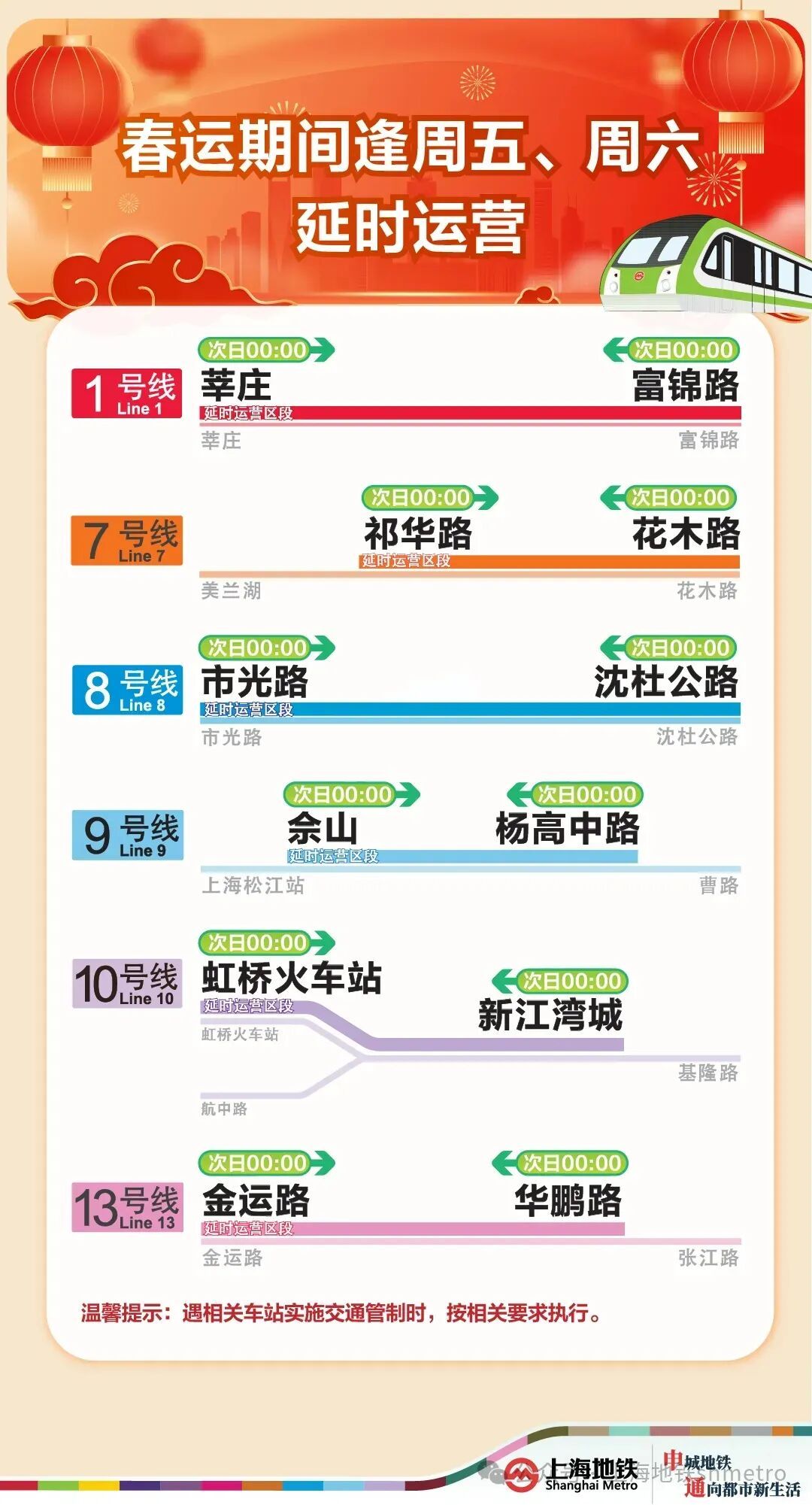 为满足“春运”期间乘客夜间出行需求,缓解中心城区夜高峰休闲、购物客流密集的压力,最大限度地满足乘客节日出行需求,逢周五、周六,地铁1、7、8、9、10、13号线将继续执行常态周末延时运营方案。