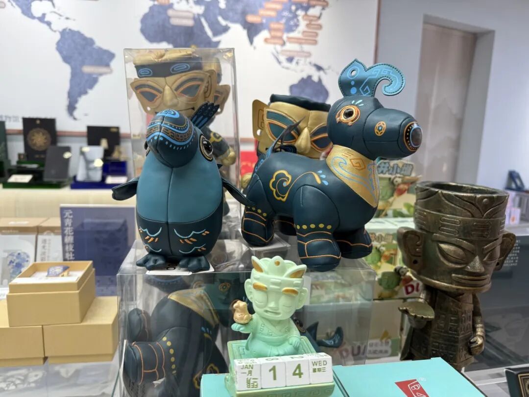 展柜里,英国国家美术馆收藏的梵高名作《向日葵》的艺术衍生玩偶、遮阳帽与大英博物馆的“盖尔-安德森猫”系列文创相邻陈列,中国国家博物馆的纸雕灯文创与海内外文博IP的趣味周边相映成趣,让文博爱好者大饱眼福。马年主题文创是当季焦点,三星堆博物馆形似马的青铜神兽文创玩偶憨态可掬,成为了店内的热销款。