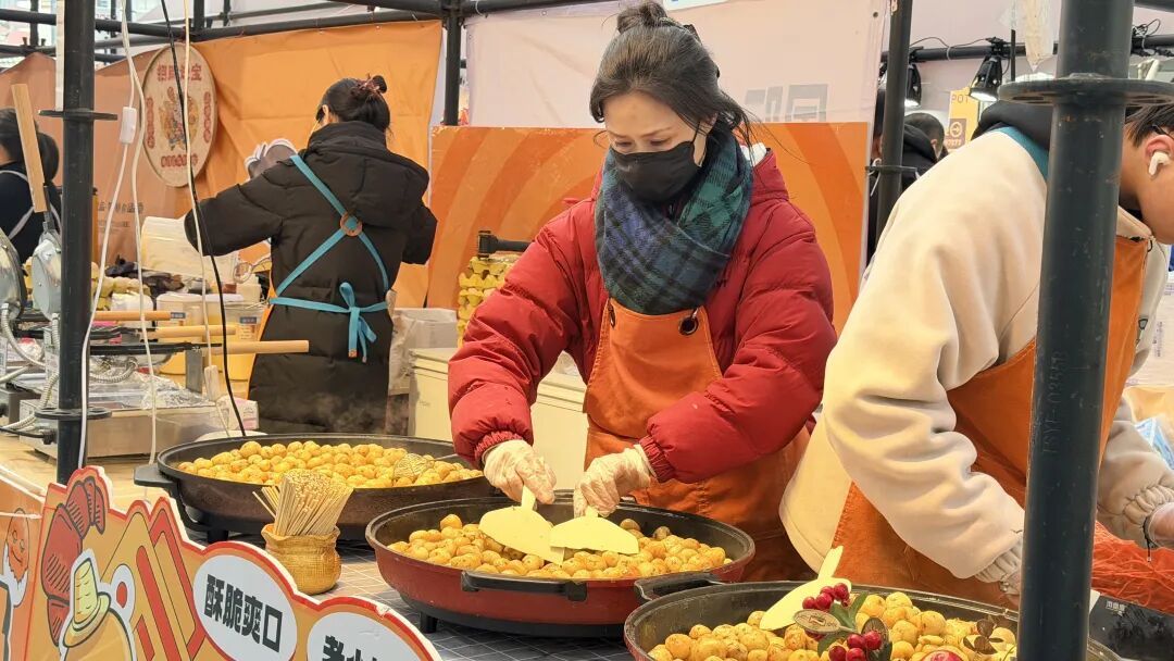 环球港的南广场和西广场上烟火气拉满、暖意升腾,80余个摊位、100多种中外特色小吃齐聚一堂,既有烤肉串、鸡肉卷等来自欧洲、东南亚的地道风味,也有煎饼、糖墩墩、现做饭团等中华美食。开市不久,各个摊位前就挤满了市民,一派热气腾腾的热闹景象。