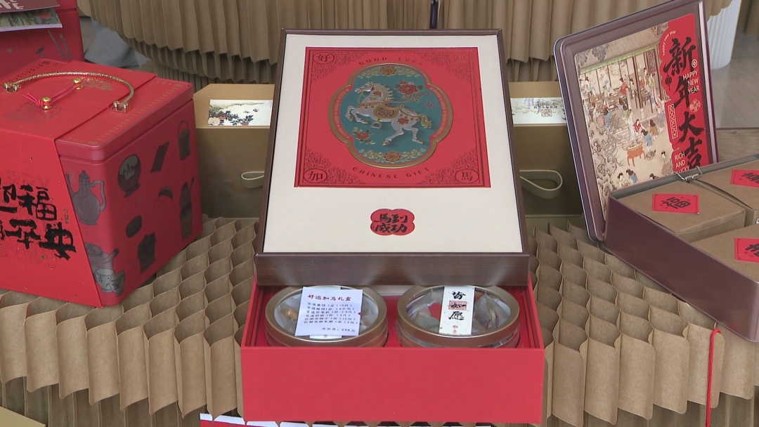 各种非遗商品中,以丙午年马为主题的商品格外醒目,像这个马年食品礼盒,马的浮雕造型精美,里面集合了非遗蜜饯、非遗酥饼、非遗坚果糕、非遗奶酥、红糖香榧子和红糖香榧子糖等六种食品。