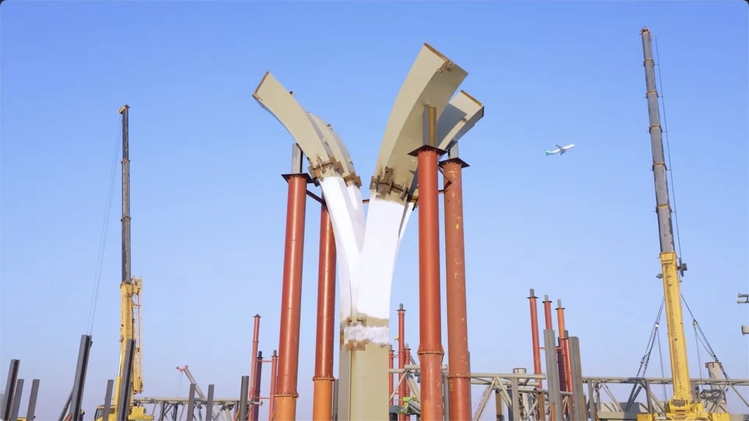 T3航站楼建筑外形呈现“翱翔”姿态,与浦东机场T1、T2航站楼“展翅”“腾飞”的建筑外形相呼应。T3航站楼国际主楼钢屋盖是“翱翔”外观的核心载体。钢屋盖施工是四期工程重要节点之一,它的推进将为后续施工打下坚实基础,助力四期工程建设提质提速、按期建成。
