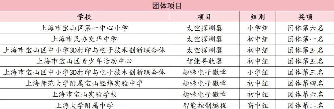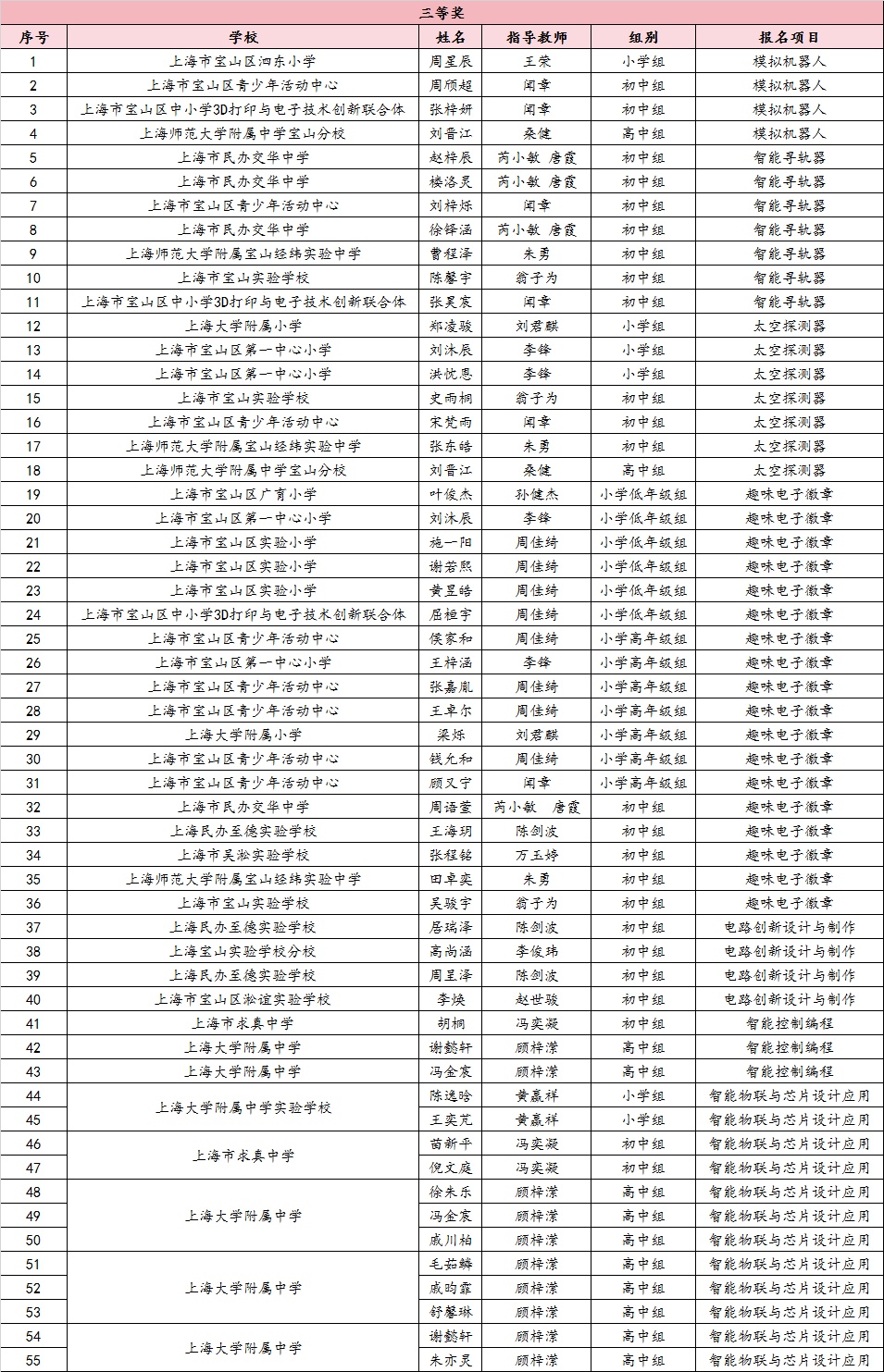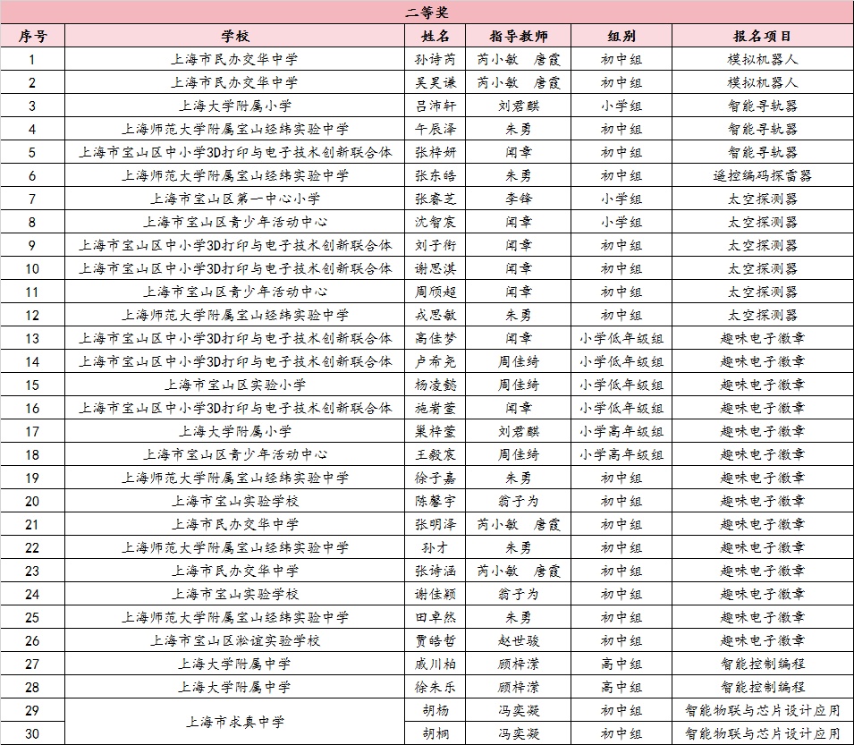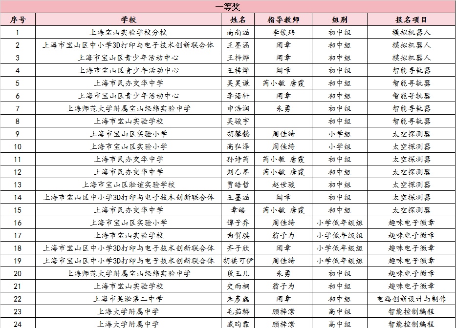 宝山学子们经过层层选拔,带着满腔热血与向着顶峰的自信投身进入了这场充满智慧与技术的比赛中,与其他选手们通过技术的碰撞,展现了卓越的电子制作技术!在紧张刺激的角逐后,最终,宝山的同学们取得了一等奖24项、二等奖30项、三等奖55项的好成绩!宝山区青少年活动中心荣获“组织奖”;上海市宝山区实验小学、上海市宝山区第一中心小学、上海大学附属中学、上海师范大学附属宝山经纬实验中学4所学校被评为“优秀组织学校”;8名指导教师获评“优秀指导教师”。