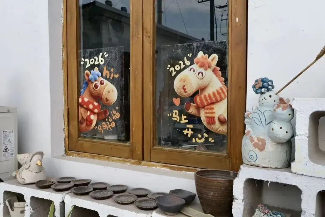 马门陶艺村共享创作中心创始人高艺峰介绍,最近马门村以“马年共创共建”为线索,将这一传统形式进行重新演绎,“传统拴马桩常雕刻狮子、麒麟等吉祥形象,我们则是将各式陶马融入其中,既展示陶艺作品,也把马元素植入村里的各个角落,传递新年祝福。”