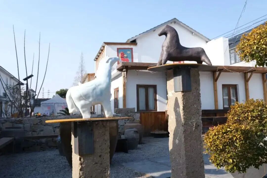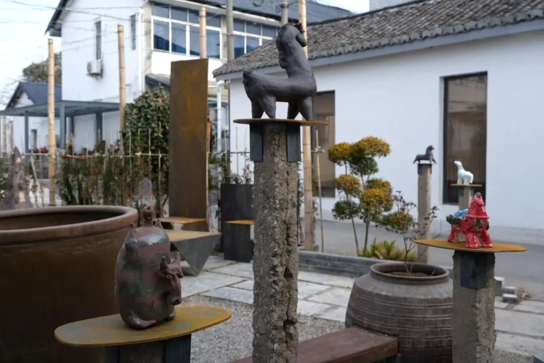 其中,最具特色的莫过于由长条形砖块与各种形态各异的陶马组合而成的拴马桩。约40根拴马桩散落在村口、路边、工作室门外与河畔,既呼应马年主题,也是陶艺作品的一种独特展示方式,成为村里一道独特的风景。
