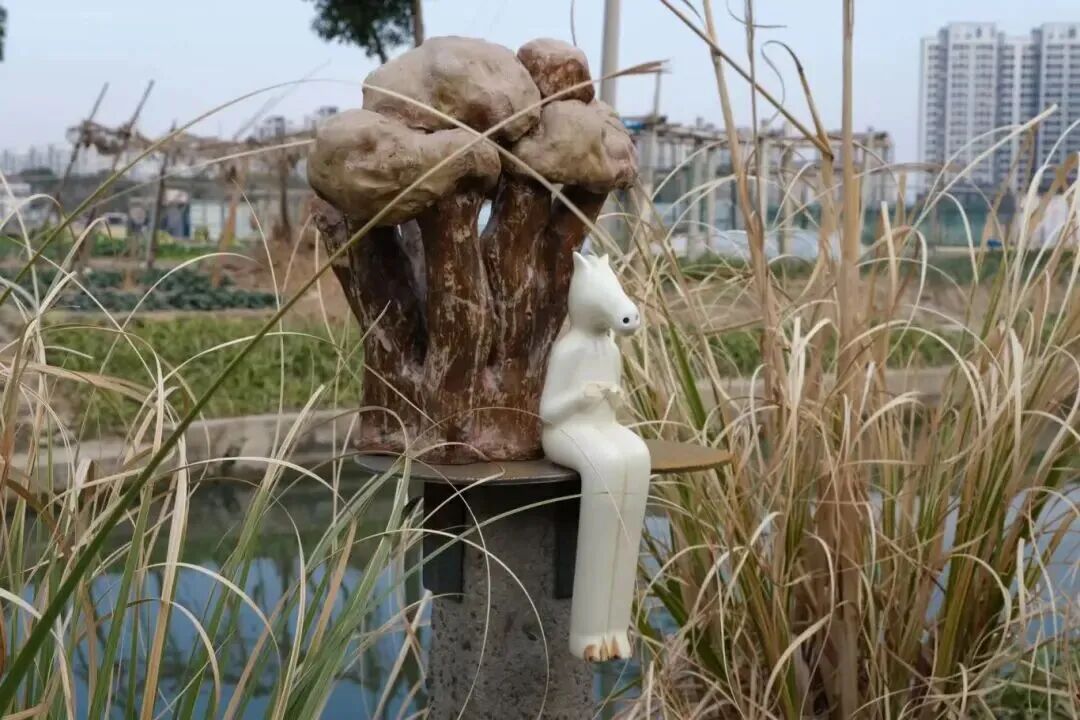 更特别的是,这些作品是孩子、村民、艺术家共同参与的成果:桩头的陶马出自学习陶艺的孩子们之手;桩身的长水泥柱来自本地村民家中菜地;整体设计与组装则由驻村艺术家们合作完成。