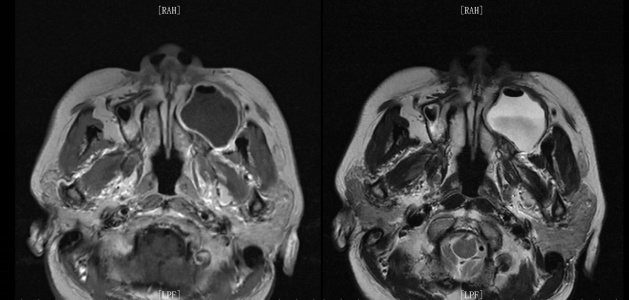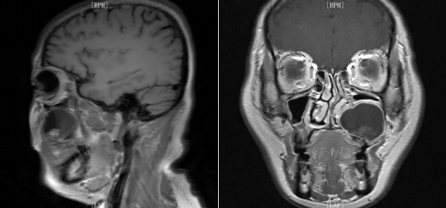 术前影像学检查:MRI检查及CT检查示左侧上颌骨内囊肿样病变,直径约4.0厘米,周围骨质呈压迫性吸收,左侧上颌窦腔被压迫缩小。