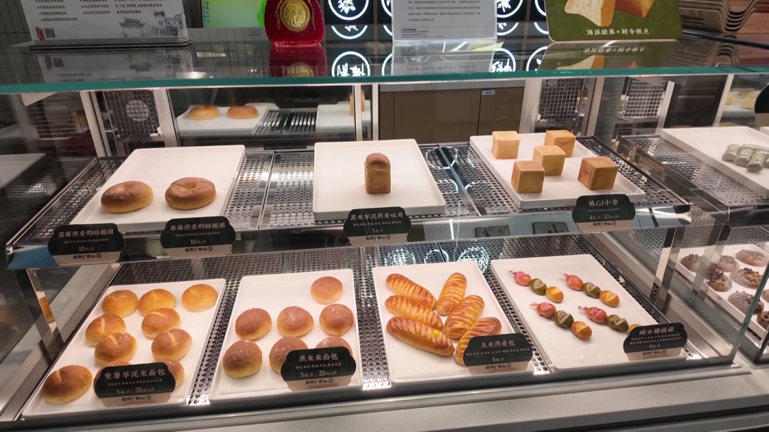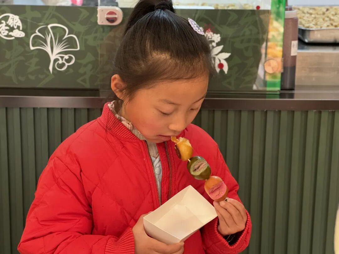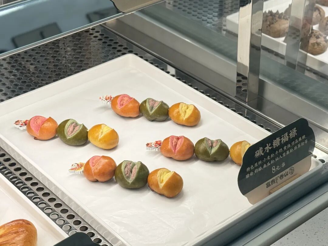 工作人员也详细介绍说:“碱水糖葫芦的形状就像外面卖的葫芦串一样。它里面有三种颜色,馅料有奶酪和小麦粉。黄色的部分添加了南瓜粉,红色的是仙人掌果粉,绿色则是抹茶粉。”