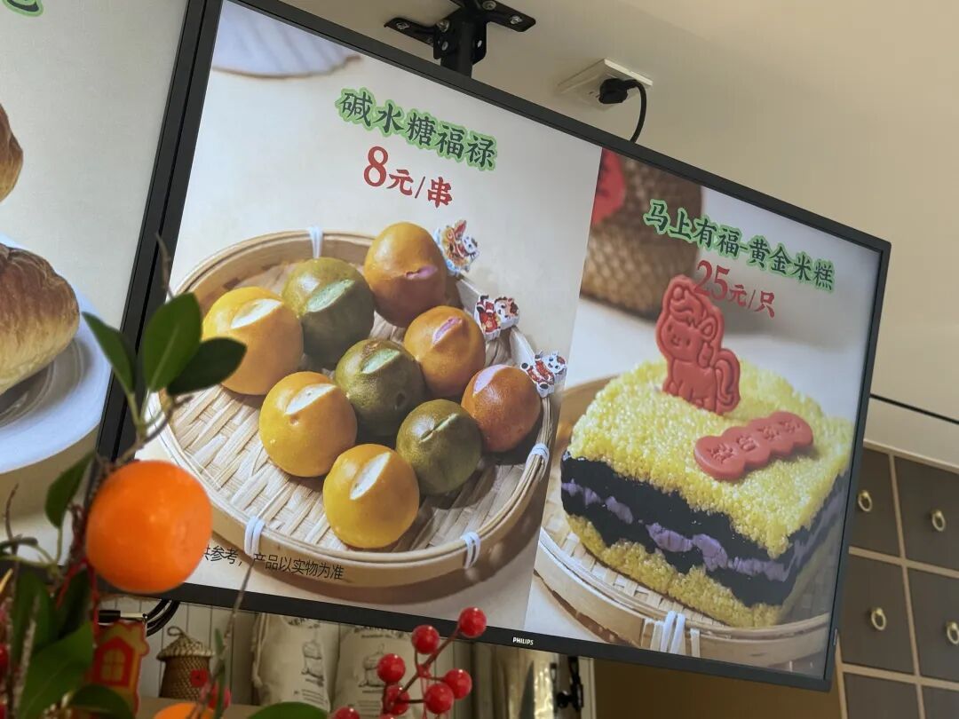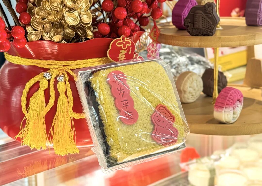 另一款名为“马上有福”的黄金米糕同样别具匠心。它采用中西合璧的设计理念,加入了两块粉色的翻糖蛋糕祝福牌。一块牌子上写着“柿柿如意”“新年快乐”等吉祥话语,另一块则是可爱的小马图画。米糕部分精选大黄米和黑米,内馅是绵密细腻的芋泥,用冰糖调味,用料十分扎实。入口糯香四溢,每一口都仿佛能让新的一年甜甜蜜蜜。