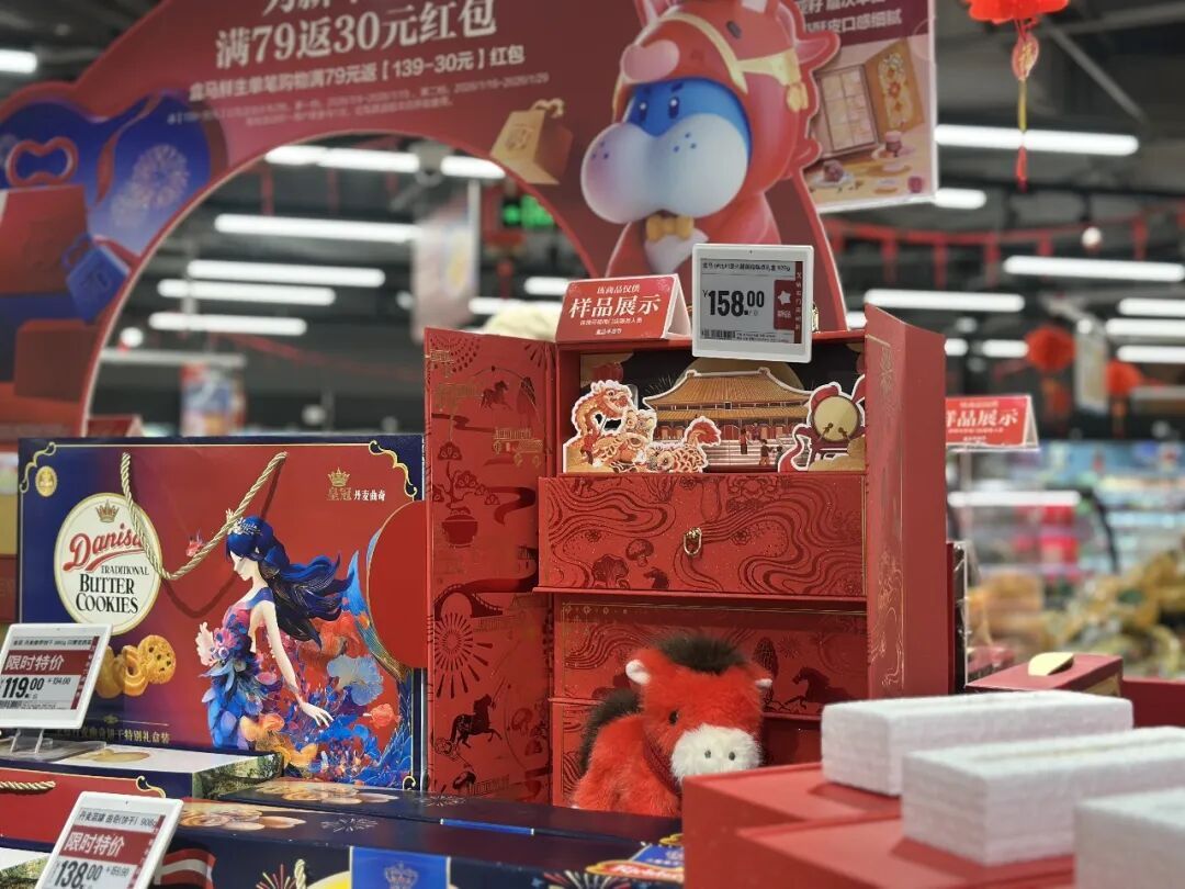 年宵花姹紫嫣红,坚果礼盒琳琅满目……走进盒马鲜生嘉定城中店,映入眼帘的是浓浓的新年氛围,年货产品种类丰富。