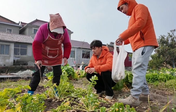 村民顾阿婆也是“闲菜计划”的参与者之一,即使是冬季,她的菜地里仍是一片青翠。韩敏杰蹲下身,帮着阿婆一起采摘小青菜,这些新鲜蔬菜将通过“闲菜计划”发往城市居民的手中。