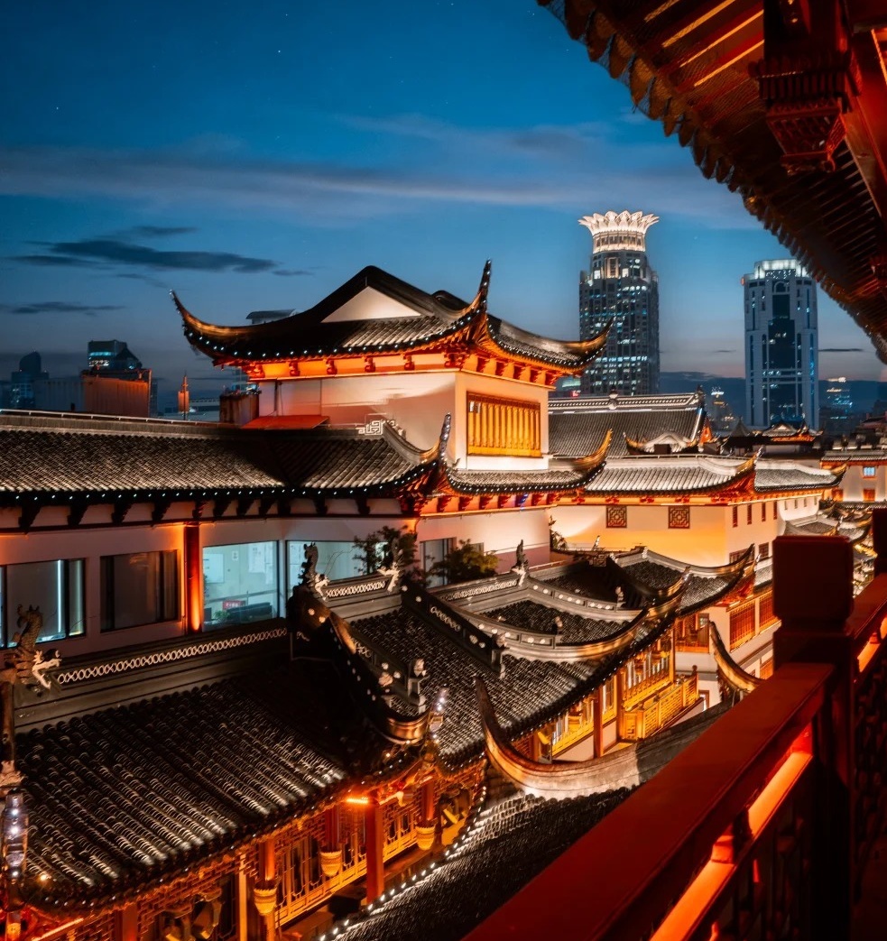 方浜中路“海上第一茶楼”牌坊:利用灯笼街的纵深做前景,背景是豫园古建筑轮廓,“新中式+市井烟火气”非常出片