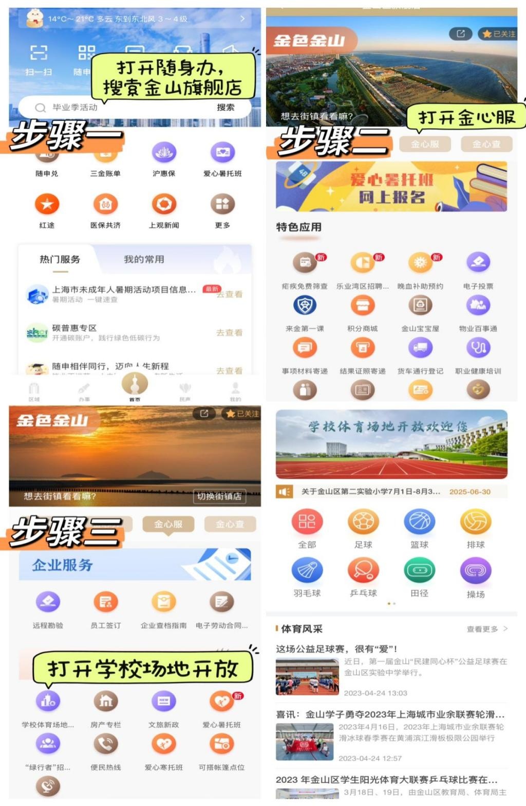 市民只需打开“随申办”App,进入“金山区旗舰店—金心服—学校体育场地开放”,即可查看全区校园场地开放详情。点击想要开展的体育项目,系统会自动展示距离最近的学校场地信息。在开放时间段内,出示“随申码”或身份证即可入校。
