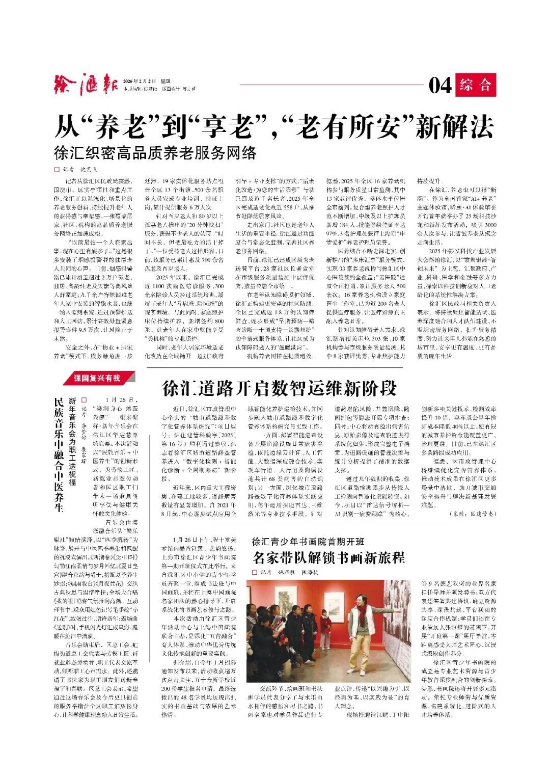 从“养老”到“享老”,徐汇织密高品质养老服务网络。智能烟感与智能手表守护老人安全,物业“20分钟快扫”与贴心助医服务化解日常难题;居家适老化改造细致入微,社区长者食堂暖意直达家门。针对认知障碍,社区建立起全链条照护体系;医养深度融合,更让专业医疗资源触手可及。在这里,养老服务化身为实在的安心与温暖,陪伴长者乐享从容晚年。