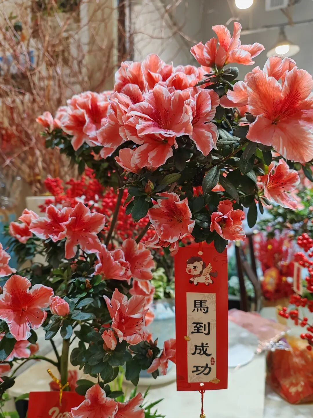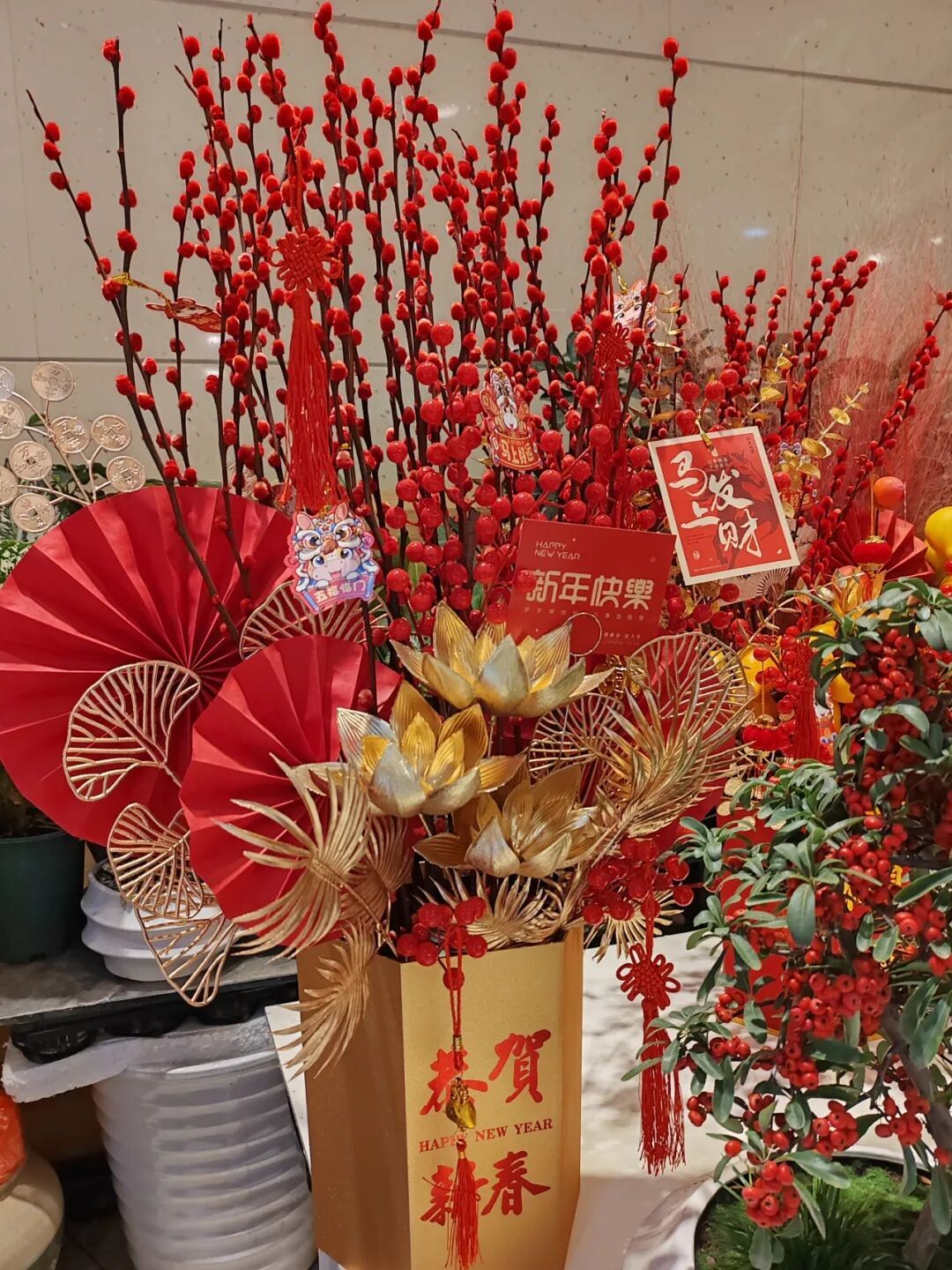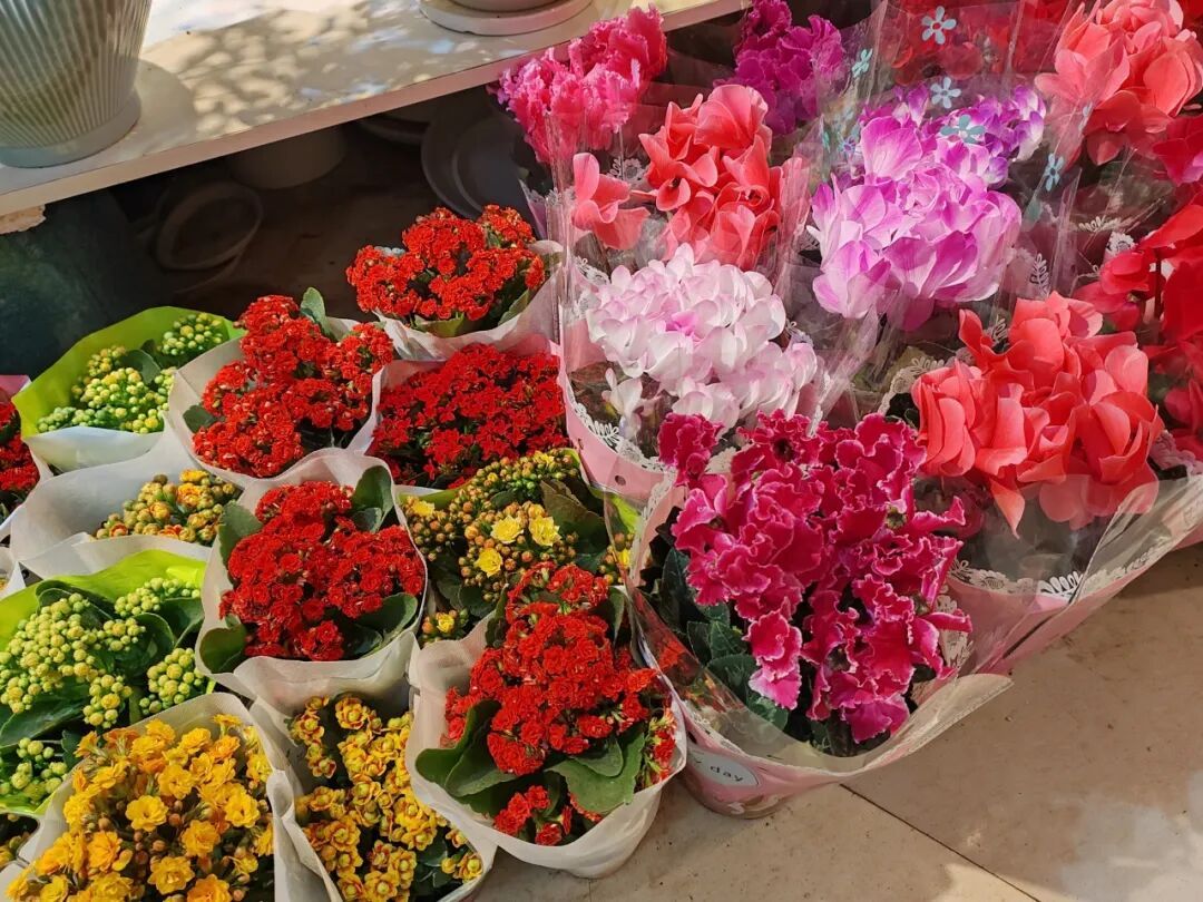 店家们早已做好万全准备,各式年宵花整齐陈列、错落有致,更精心搭配了寓意美好的装饰。红色蝴蝶结随风轻摆,迷你小灯笼小巧可爱,“平安喜乐”“马到成功”的福卡点缀在花丛间,将吉祥寓意拉满,也让每一盆花更具年味,引得过往市民频频驻足观赏、拍照留念。