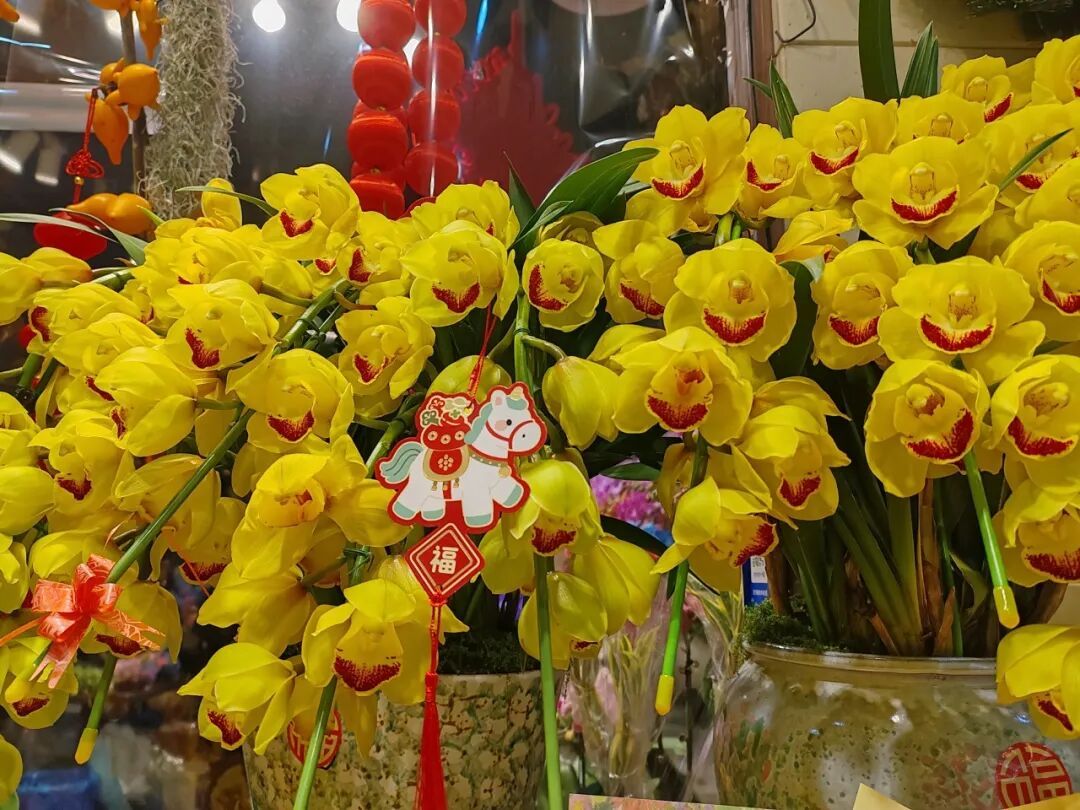 据商家介绍,最近两周,各类年宵花已批量上市,今年的年宵花依旧延续了往年的热门品类,其中蝴蝶兰、大花蕙兰等花型饱满、花色艳丽、寓意美好的品种最受市民青睐。