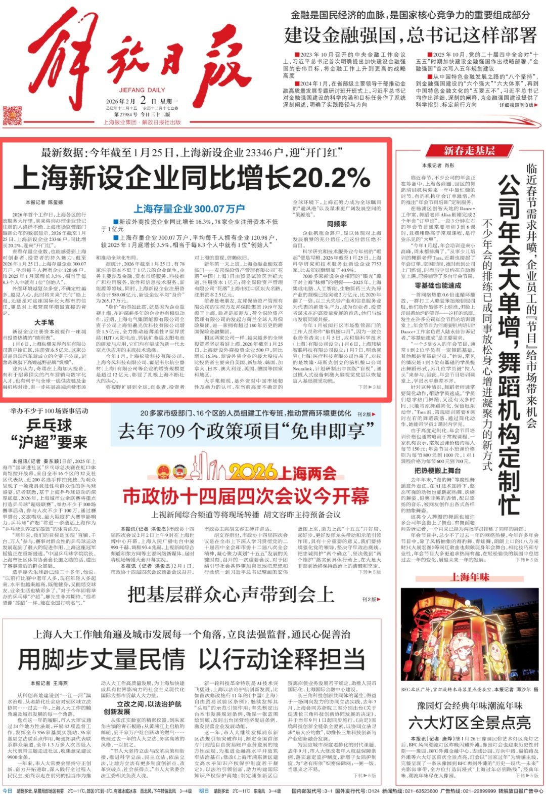 上海市场监管部门最新公布的数据显示,2026年截至1月25日,上海新设企业23346户,同比增长20.2%,迎来“开门红”。