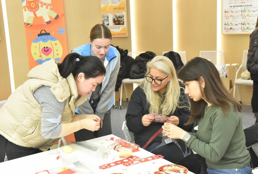 现场,一位身穿蓝色志愿者服装的女孩正亲切地为外国家庭担任翻译,成为年俗文化传递的桥梁。她是华东师范大学的俄罗斯留学生瑞娜,此前因参加街道越剧活动与中国文化结缘,这次是她首次担任志愿者。瑞娜说:“我很喜欢中国文化,希望我的介绍能让更多外国朋友了解和爱上中国传统文化,甚至开始学中文。”