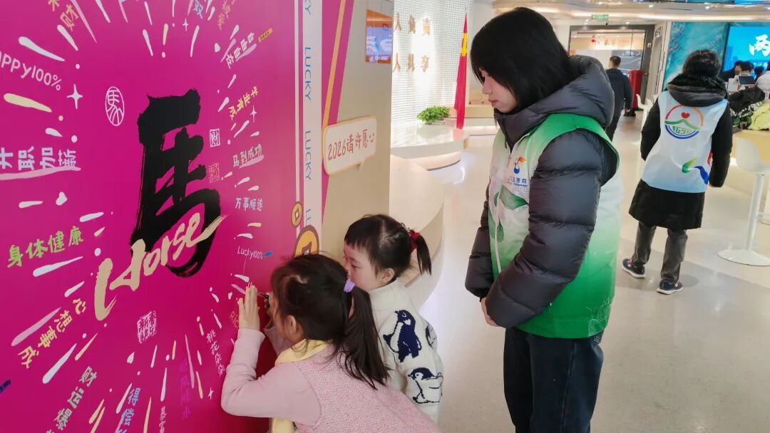走进半马苏河驿站·1690党群服务中心,一眼就能看见喜庆的“骏马腾飞”主题打卡墙,上面写满了新春祝福,也留下了不少合影的笑脸。现场挂满马年剪纸与生肖灯笼,处处洋溢着红火的年味。舞台上,社区居民与中外友人轮番登场,带来消防安全情景剧、古筝演奏等精彩节目。