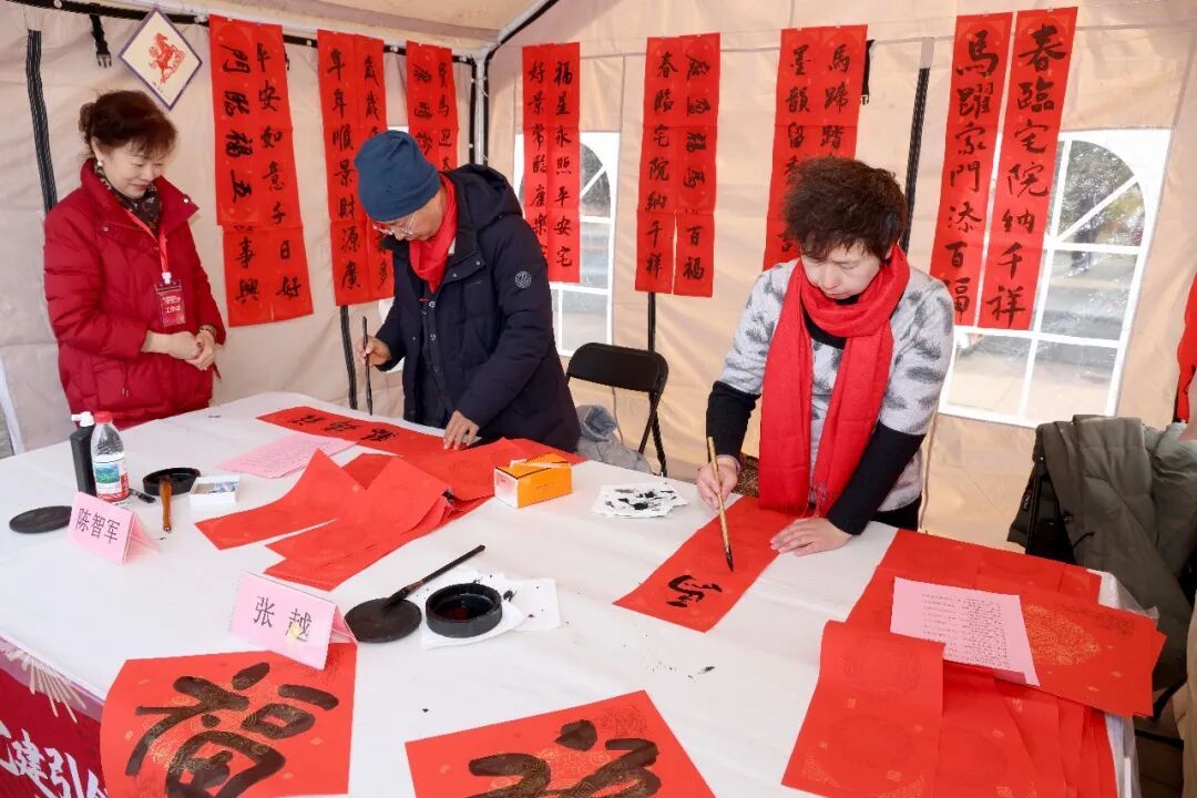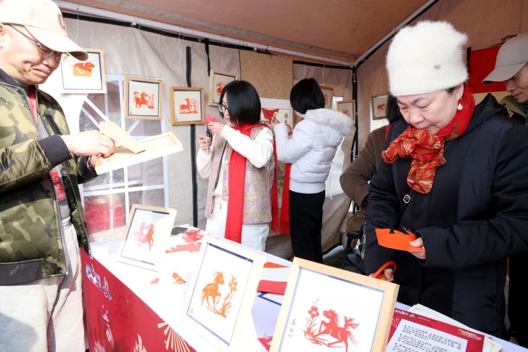 传统文化体验区最受青睐。市级书法家协会的老师和社区书法爱好者们现场挥毫泼墨,免费为市民书写春联和“福”字,“骏马奔腾迎福至”“马跃家门添百福”等佳句跃然纸上,红纸墨香间年味十足。非遗剪纸传承人现场教学,剪刀翻飞间,一幅幅寓意吉祥的马年生肖剪纸栩栩如生,吸引了许多家庭参与。