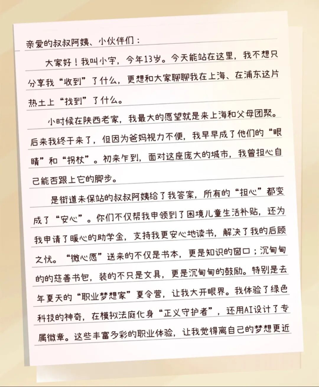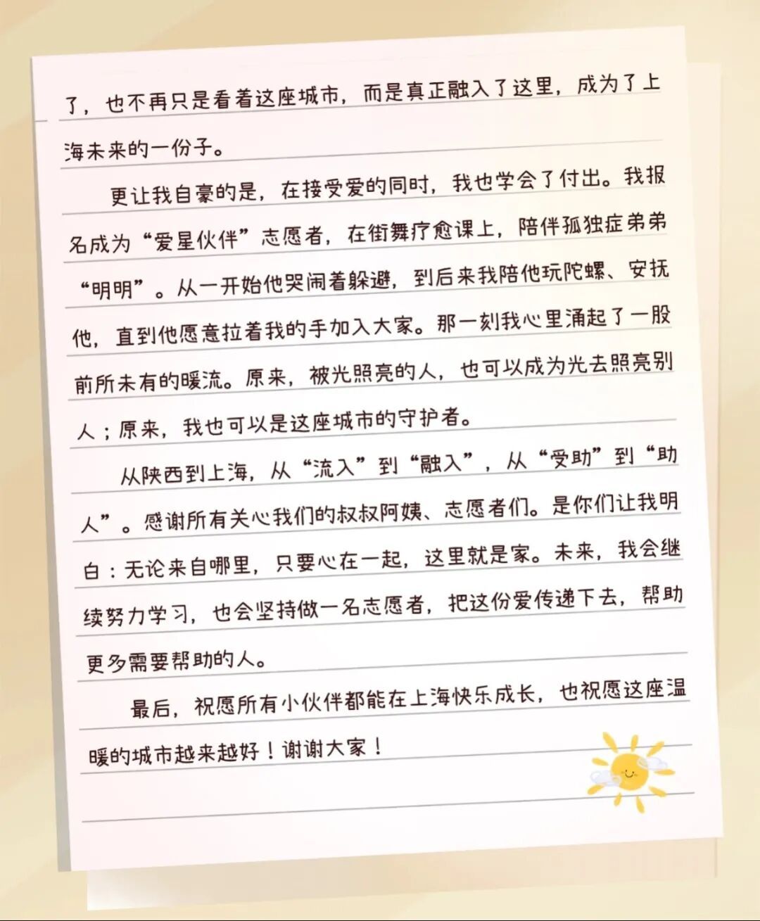 现场,一名来自浦东新区的13岁流动儿童分享了他的融入故事。他不仅通过2025年“守‘沪’童心”微心愿和夏令营感受到了城市的温暖,还成长为一名“爱星伙伴”志愿者,帮助孤独症儿童。他说:“被光照亮的人,也可以成为光去照亮别人。”他的经历,正是上海流动儿童从“流入”到“融入”、从“受助”到“助人”的生动缩影。