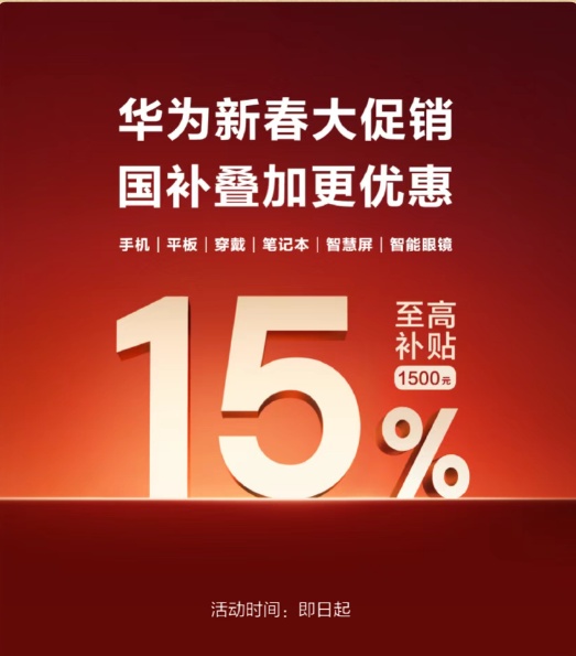 华为同步开启新春大促销,手机、平板、笔记本等多款产品叠加国补福利,为新春增添科技质感,从穿搭到数码,全方位满足新春焕新需求。