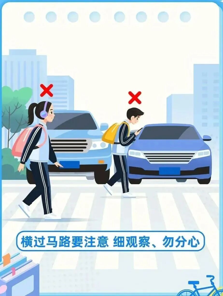 2.过马路走横道线,“一停二看三通过”,不翻越护栏,不闯红灯,不边行走边看手机。