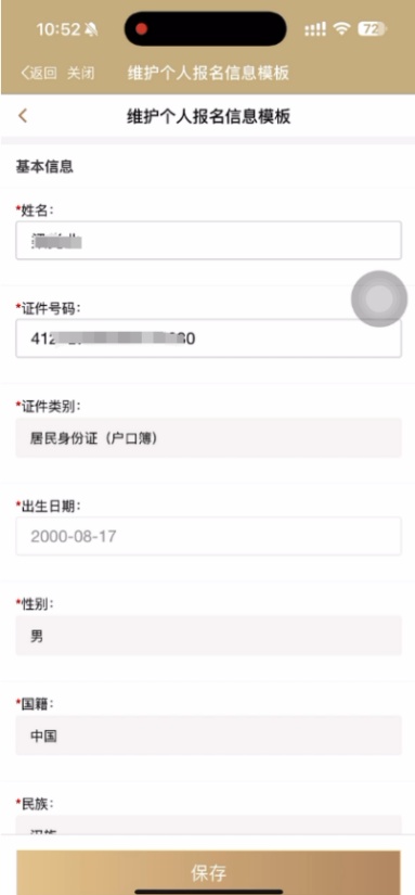 2)点击“维护个人报名信息模板”,正确维护个人信息、教育经历、工作经历、家庭成员等信息,并上传本人近期免冠正面证件照片,保存至个人报名信息模板中。