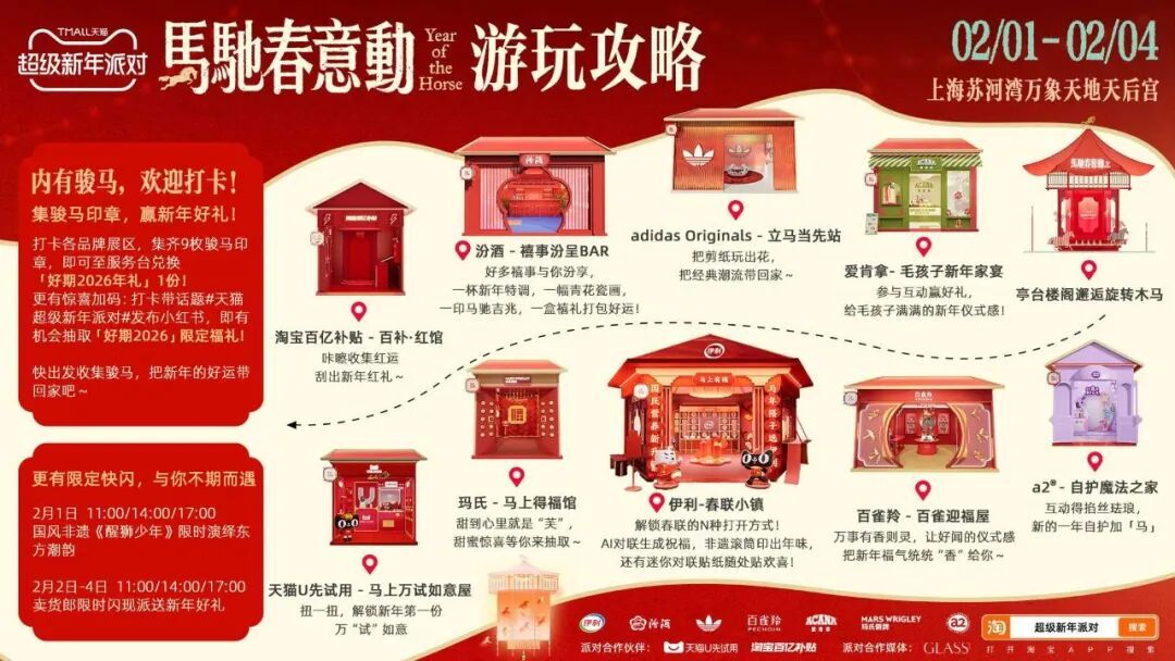 继华伦天奴“华灯驭梦”灯会与COS限时臻享空间相继点亮新春时尚年味后,2月1日至2月4日,一场更具烟火气与社交活力的“马驰春意动”天猫超级新年派对正式接棒,激活年轻社交新场景,营造热闹纷呈的派对氛围,也为静安区的新春地图增添了一抹浓厚的潮流年味。