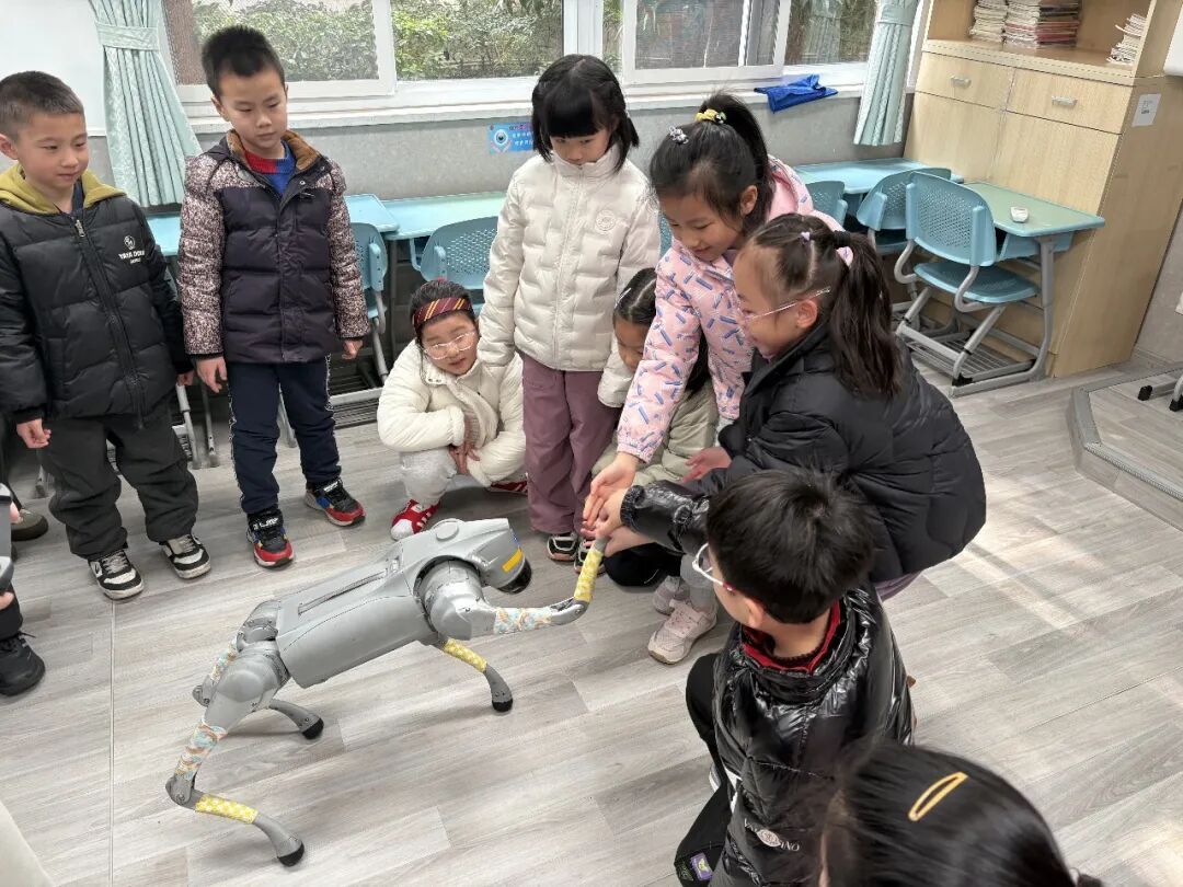 AI机器人、机器狗互动体验成为课堂热门内容,孩子们近距离观察机械结构与运行原理,通过互动操控、指令响应等形式,直观感受人工智能技术的应用场景,在趣味体验中点燃科创热情。